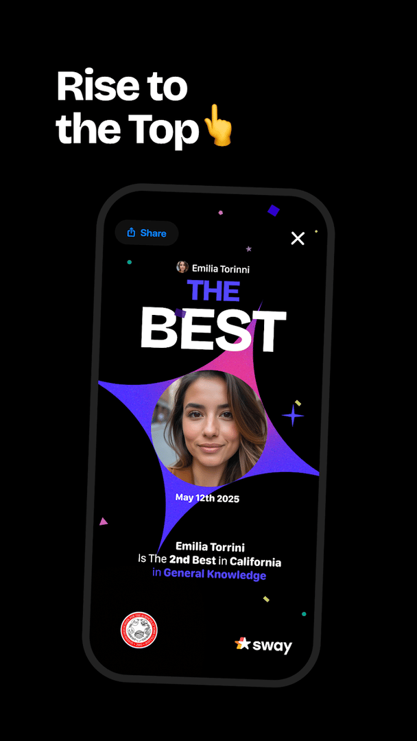 Everyone has that one thing they know better than anyone else. On Sway, you can prove it. From Taylor Swift, NBA, Harry Potter, Pokémon, One Piece, Star Wars, and Minecraft to world capitals, memes, hip hop, and ancient history. Crush quizzes in hundreds of topics and climb the global ranks.
