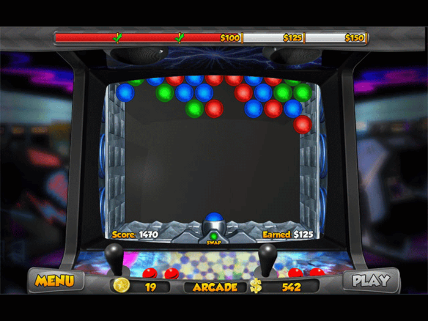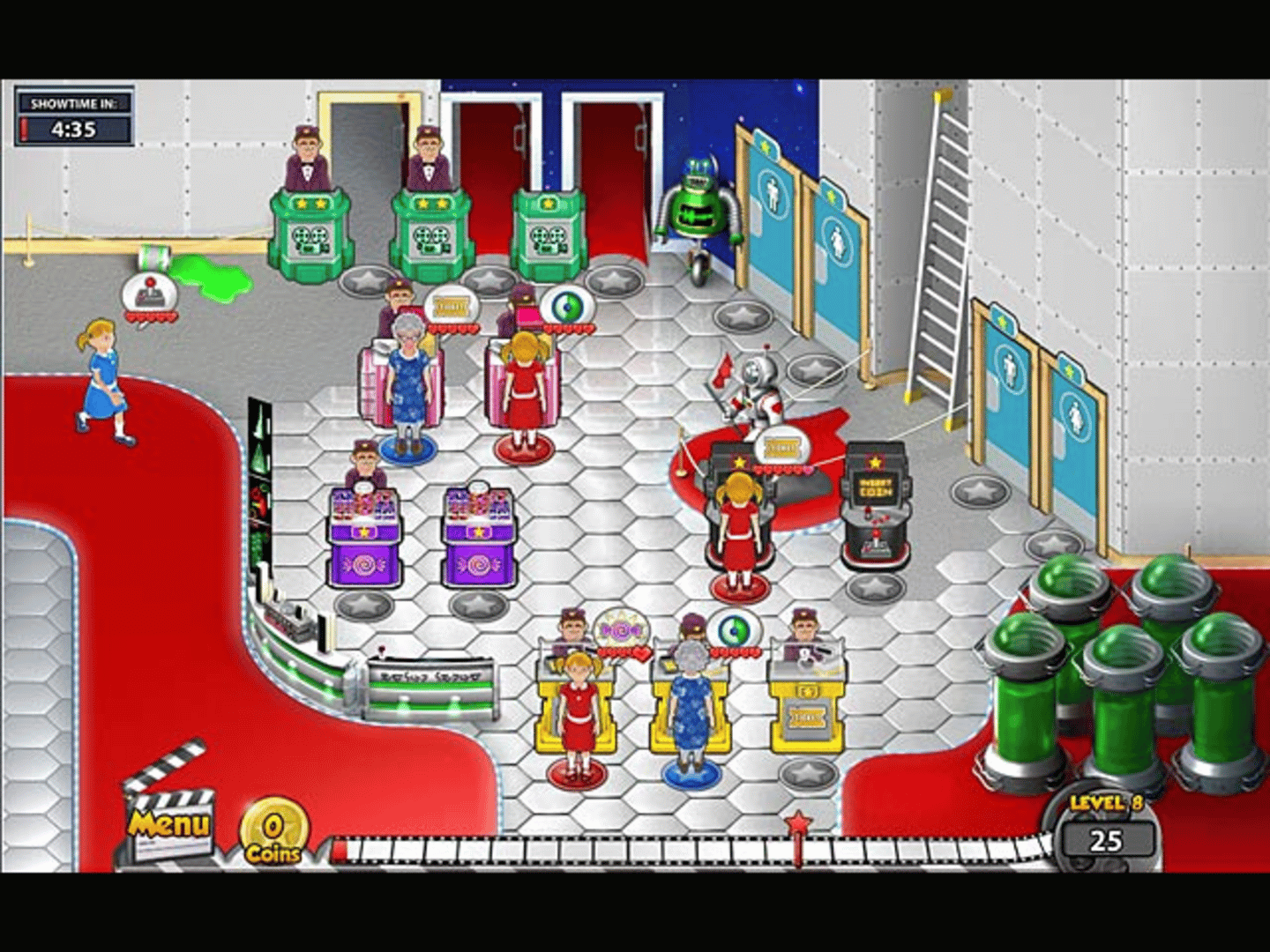 After much success refurbishing Movieville's cinemas, you've decided to build the town a movie megaplex with 5 uniquely-themed theaters. Use your fast fingers to serve movie goers and make cash to buy upgrades. Hit Expert level to earn tokens for arcade mini-games and hit Master level to choose theater decorations, like a rocket for your sci-fi theater.