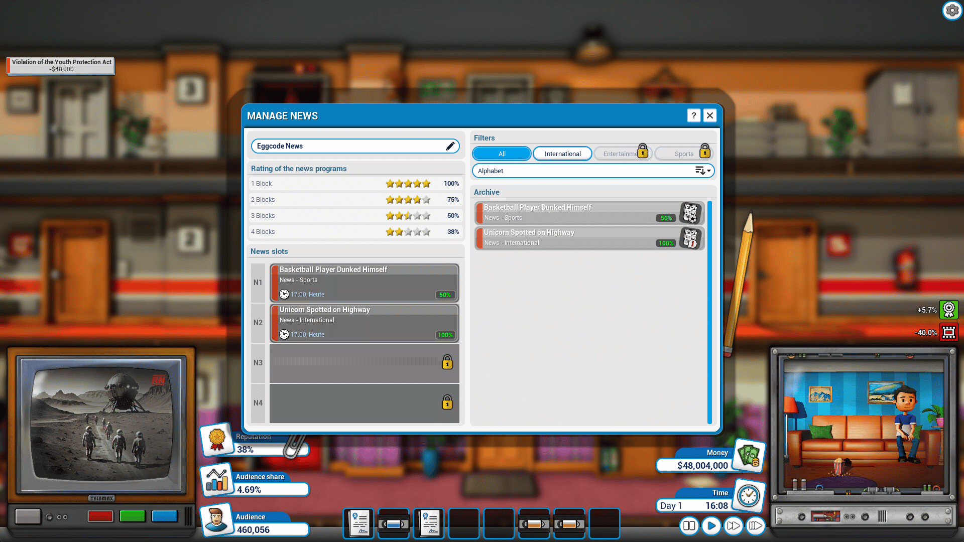 In Mad Television Tycoon, you take control of a TV station. Accept the challenge and lead your network to success. Your task is to create a diverse schedule, maximize advertising revenue, and outshine the competition.
