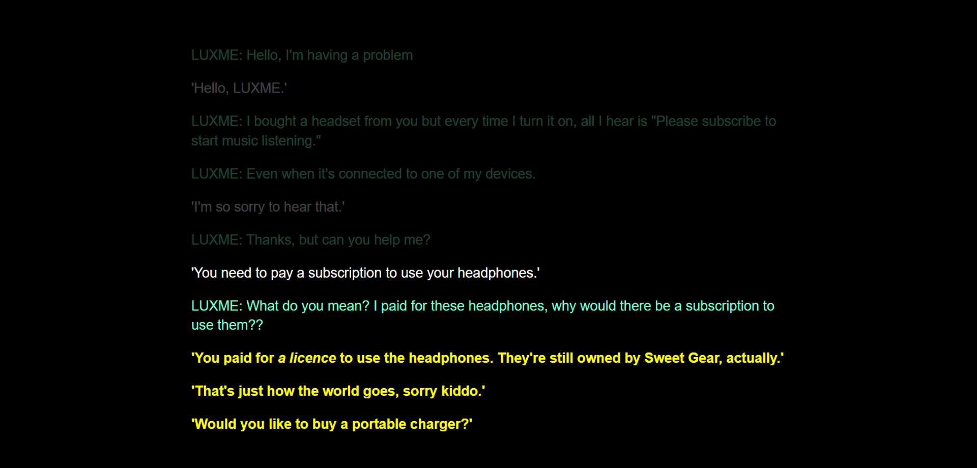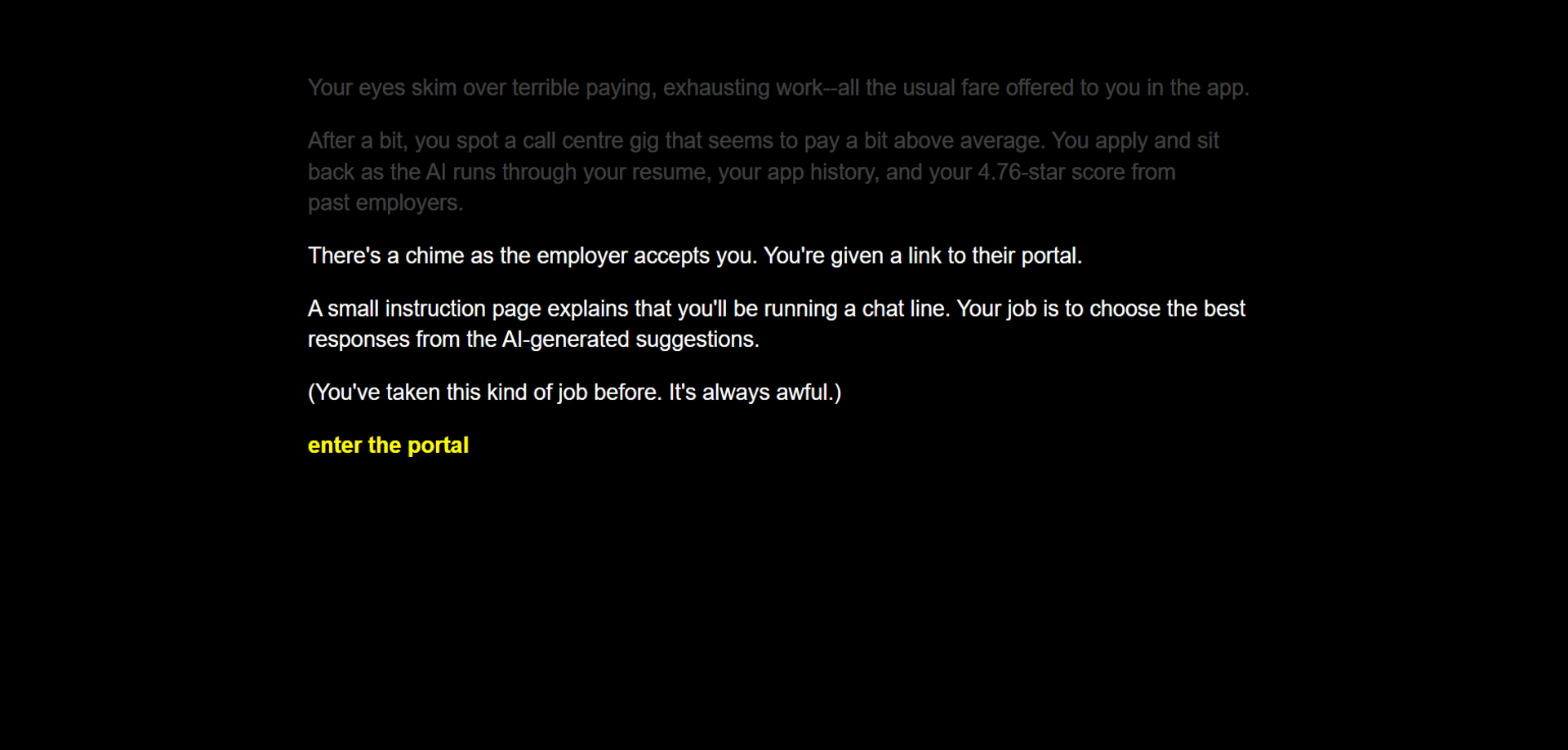 In It Makes for Painful Work, you spend a few days as a contract worker in a late-capitalist hellscape where you'll do fun things such as customer service, review AI training data, and vote for slogans made by terrible AIs.