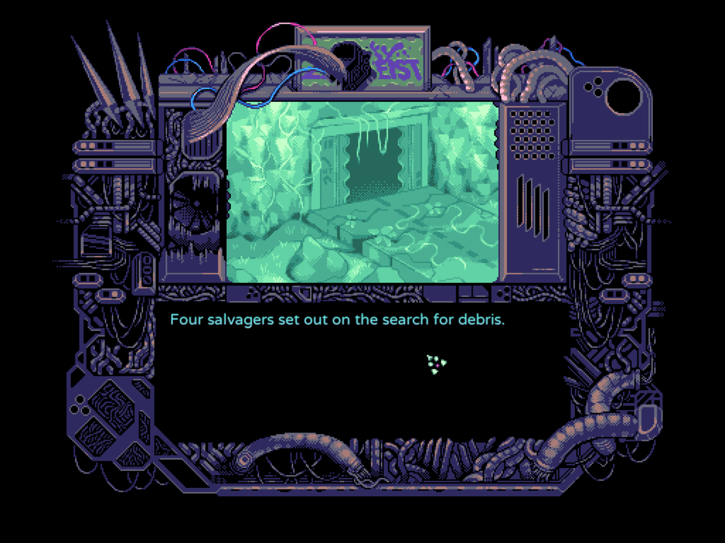 No World Dreamers: Sticky Zeitgeist is an episodic game-comic about a town plagued by space waste, and the girls working to clean it. After a satellite in orbit is destroyed, the company INNOCENT tasks itself with scavenging for the fallen parts, placing its workers at risk for radiation. In the first episode, players meet Ever, Brava, Chalcedony, and Agate, animal and robot girls who work at INNOCENT. Players quickly immerse themselves in the culture of No World Dreamer’s swamp world.