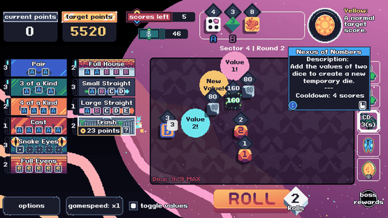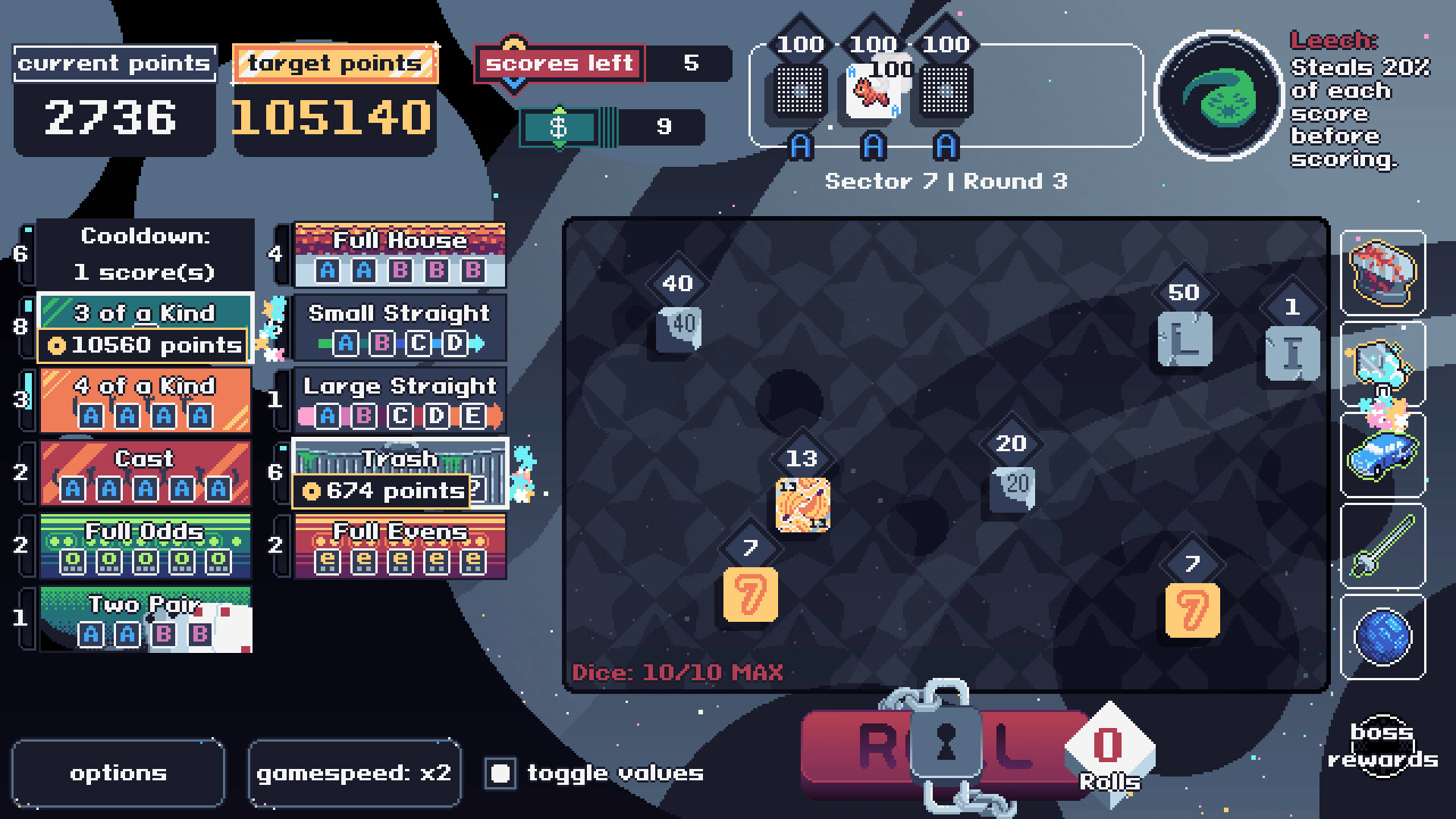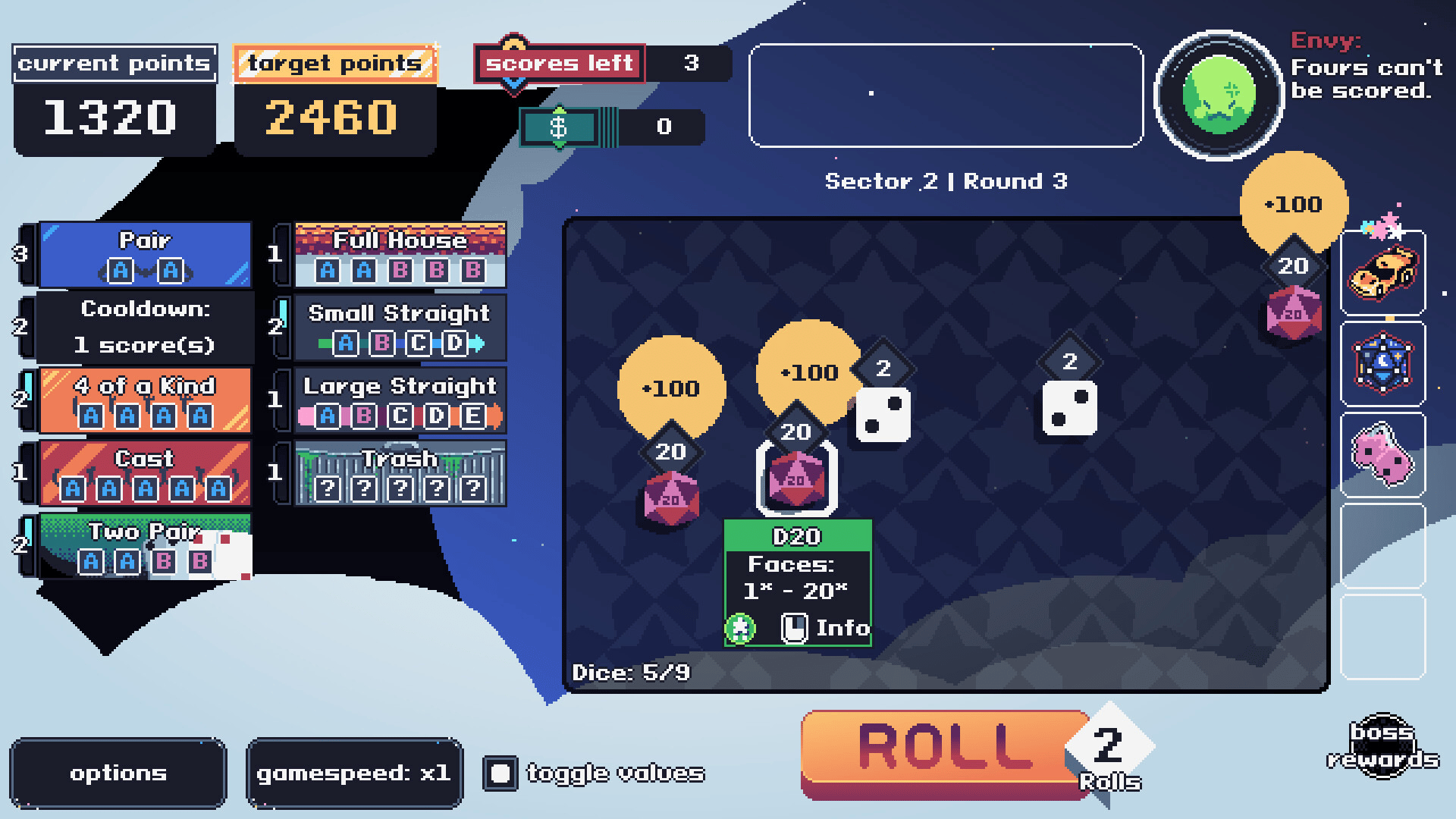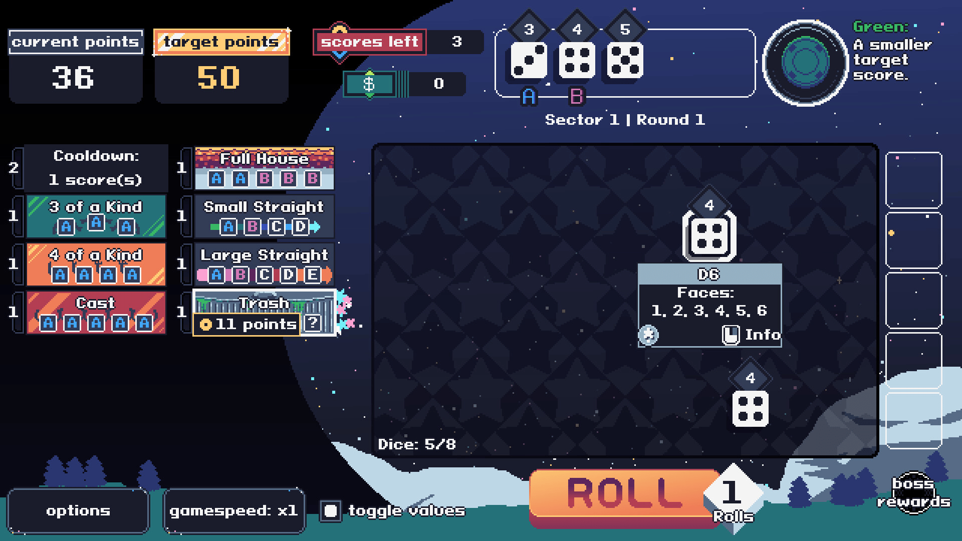 Diecast is a score-chasing roguelike deckbuilder about rolling dice to make scoring hands. Buy new dice, items, or scoring hands to increase your score, and chance of going further.