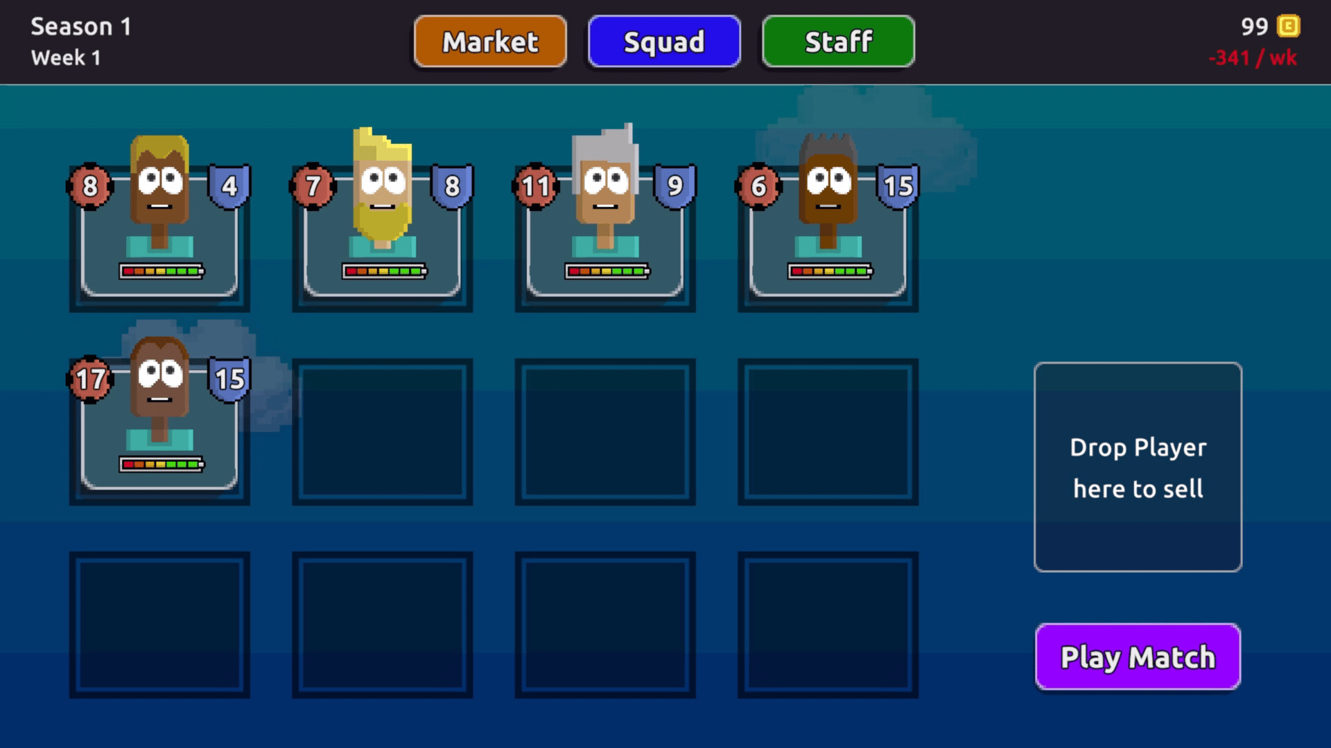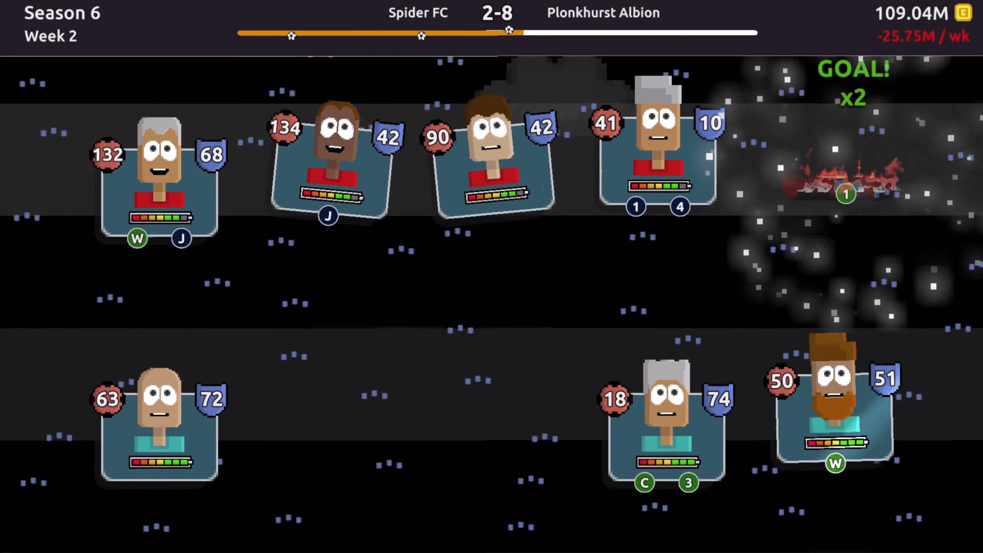 This game is a sports management roguelike deckbuilder. Craft a team of players, power them up, and try to keep them match-fit. Hire staff to bend the rules of the game in your favor, and discover overpowered combos to rise to the top of the Faceball pyramid.