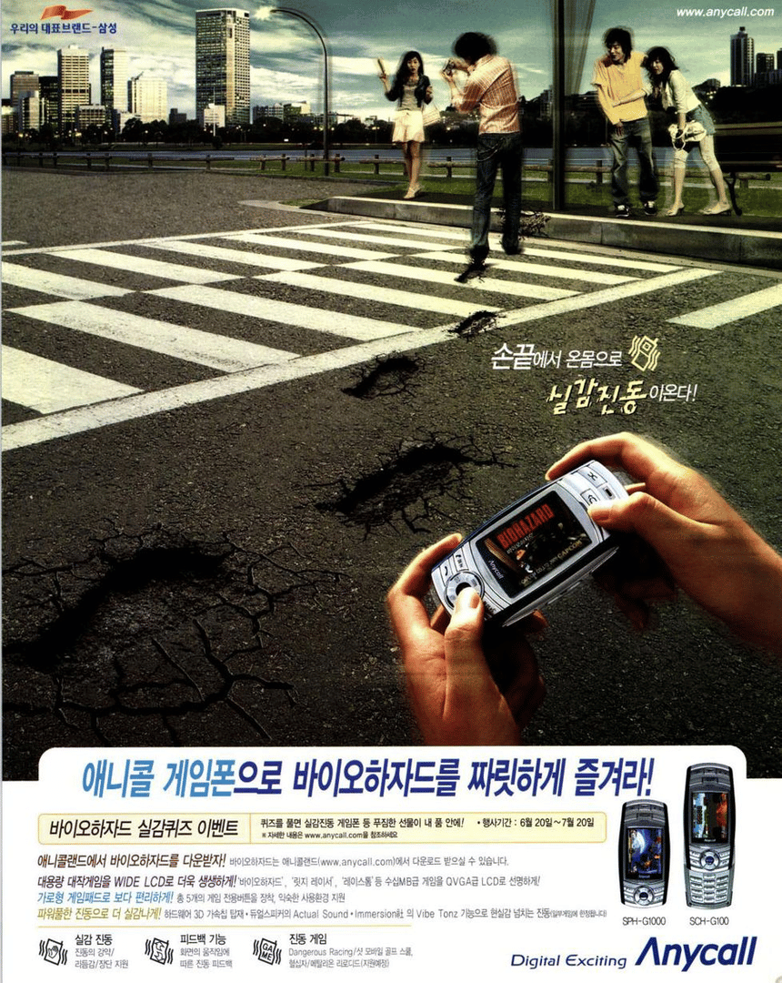 BIO HAZARD is a port of Resident Evil for the Korean mobile phone models SCH-G100 and SPH-G1000 released on 15 June 2005. It is the first title localized for Korea. The was distributed through the GXG platform for the SCH-G100 and GPANG for SPH-G1000 where buyers had to download the game to a PC, and then transferred the files to a compatible phone.