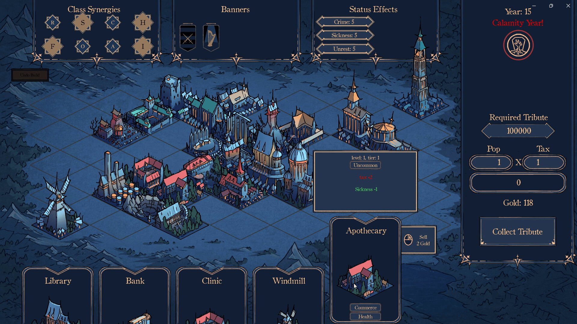 A roguelike city-building game focused on short satisfying runs. Buy unique buildings from a shop, place them strategically and manage class synergies and statuses carefully to meet the tribute requirements and survive for 25 years!