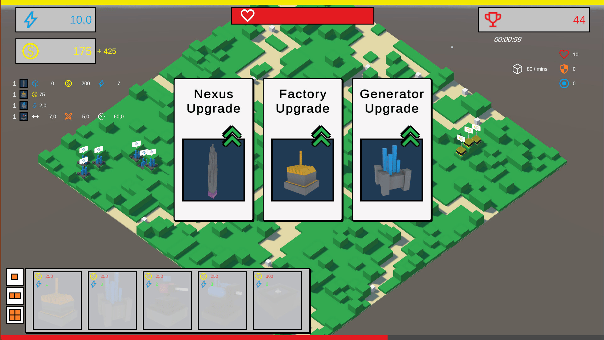 Cube Guardian: Tower Defender is a rogue-like tower defense game on a procedurally generated, cube-based battlefield. Protect the Nexus by strategically placing resource buildings as enemy waves intensify every 10 seconds. Earn XP to unlock upgrades and beat your high score!