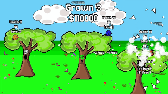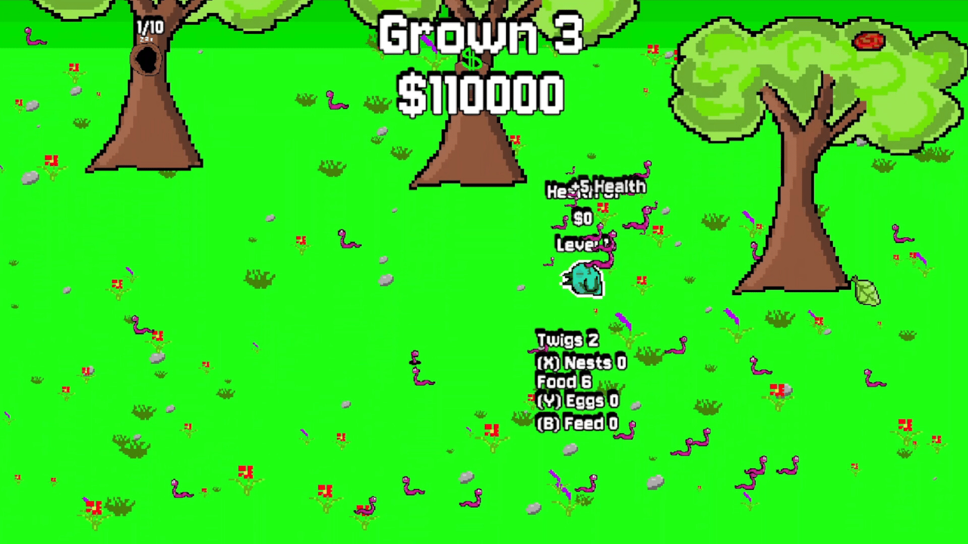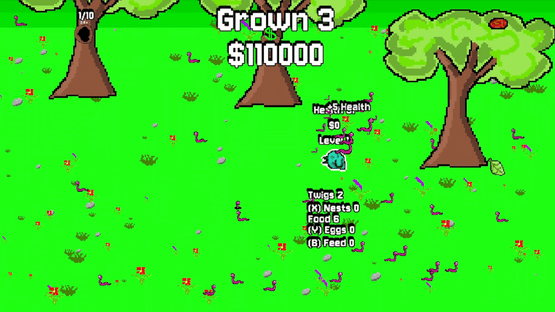 Frantic bird management survival game. Collect worms, collect twigs, create a nest with twigs, lay eggs and hatch new birds and feed them until they are fully grown. Collect jewels that appear as a bird is fully grown. Avoid the bad birds that can send your bird crashing and lose the game.