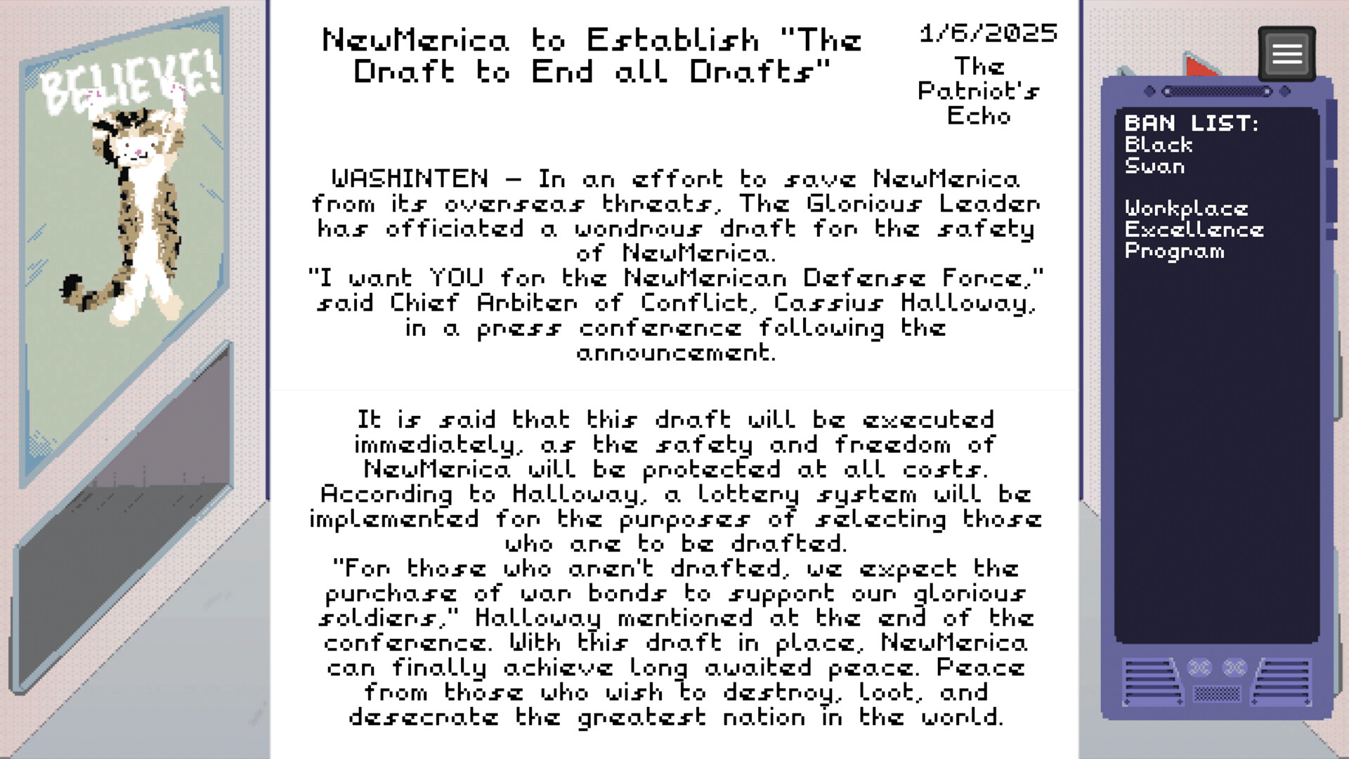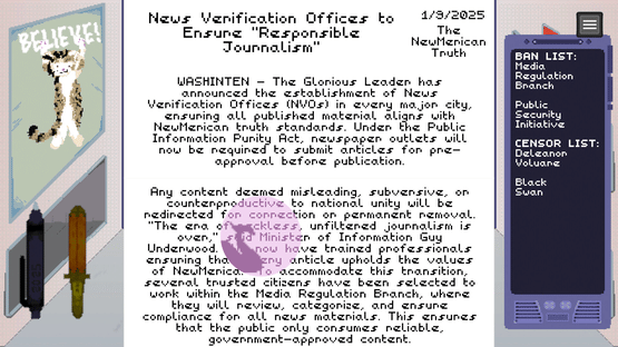 Congratulations! You are selected to work in the Media Regulation Branch to safeguard NewMerican values. Dive into this dystopian puzzle game; censor newspapers, discover secrets, and ban those who oppose NewMerica.
