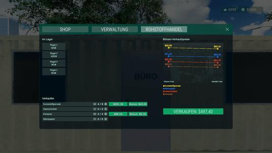 Convert trash into valuable resources by using the new recycling machines. Store away the finished pallets with the forklift and sell them at the commodities exchange when prices are up.