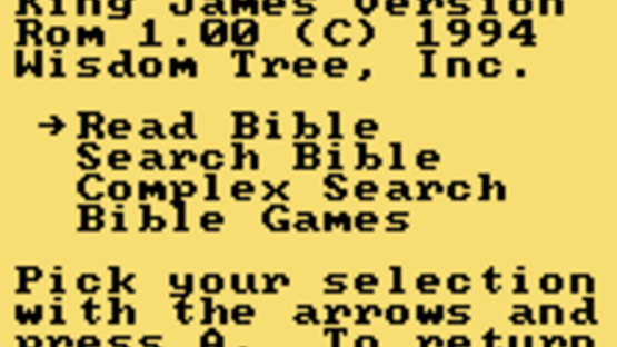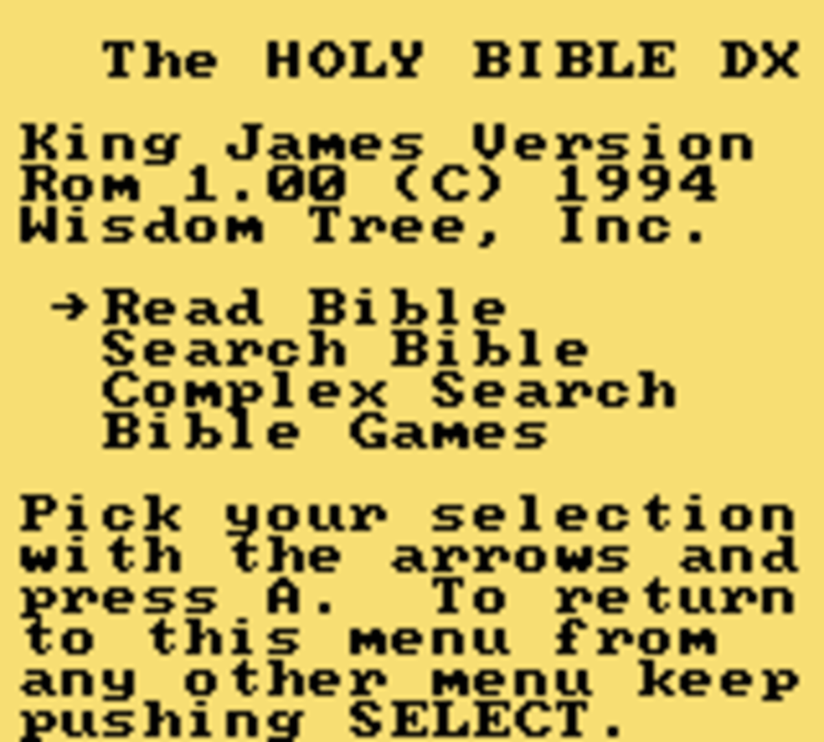 Read the Bible…in color. Search the Bible…in color. Match words from the Bible…in color. Guess words from the Bible…in color. This hack brings Wisdom Tree’s Game Boy Bible to the GBC.