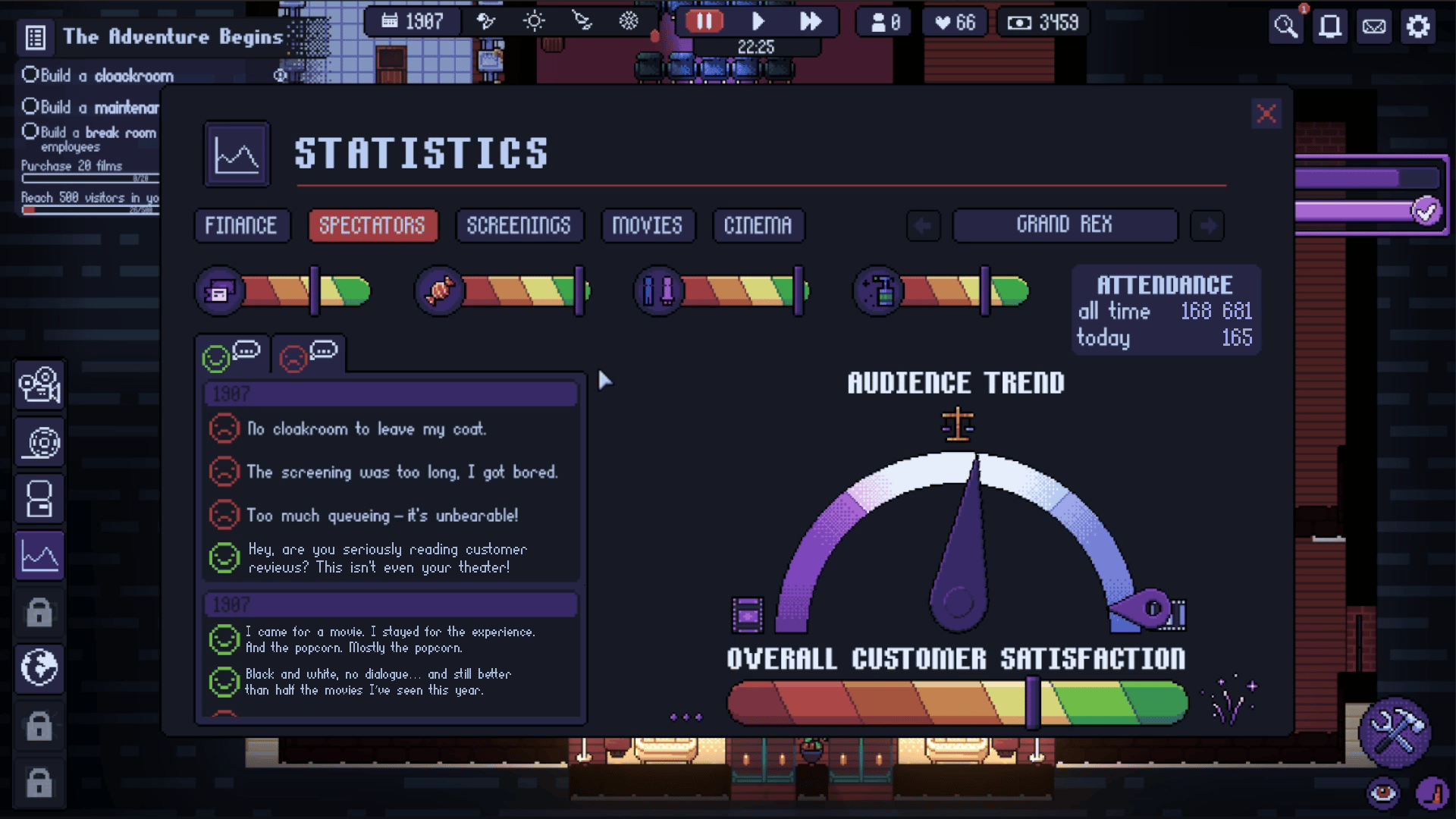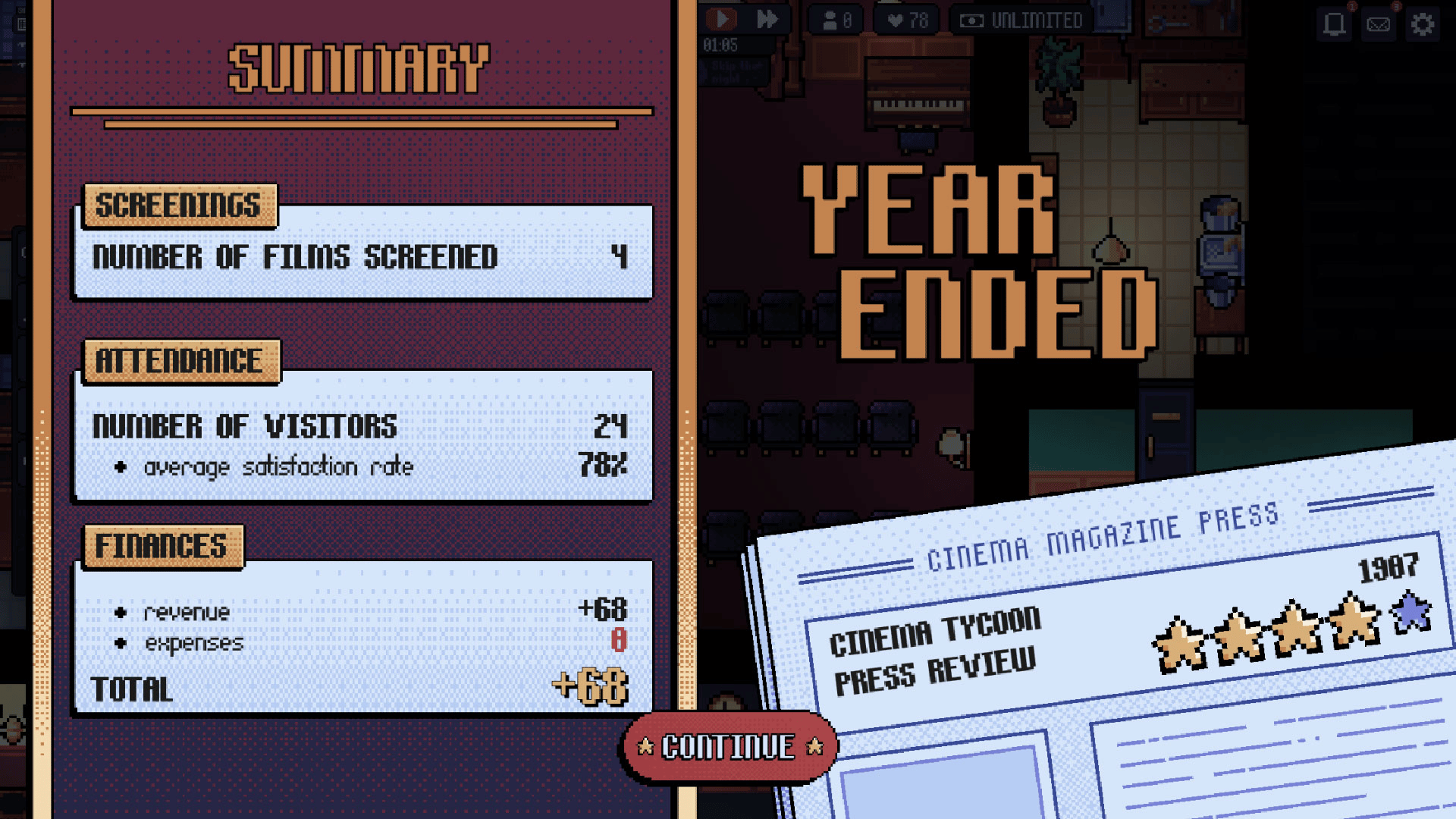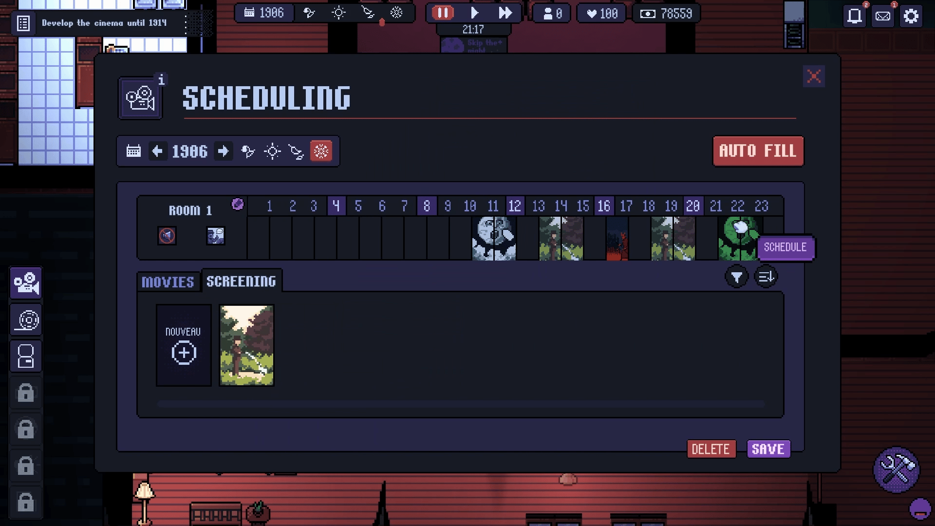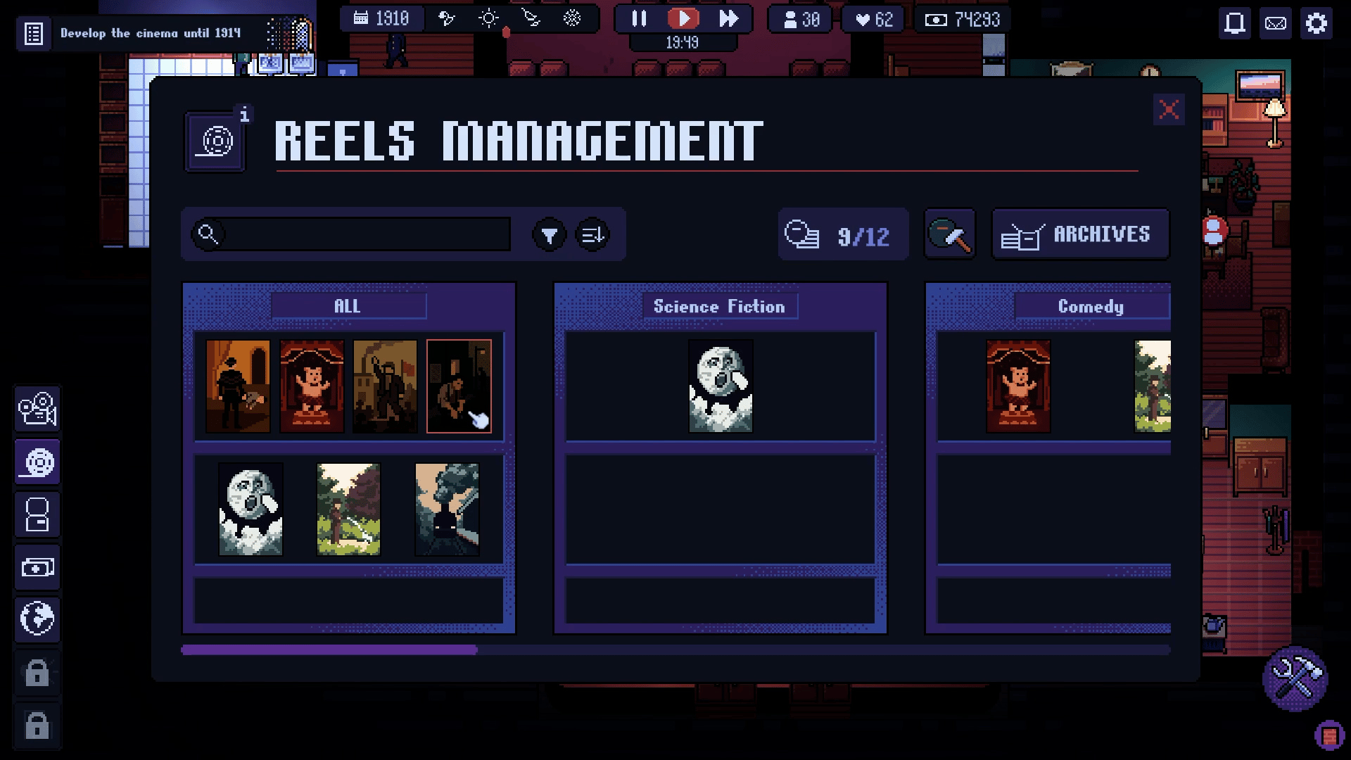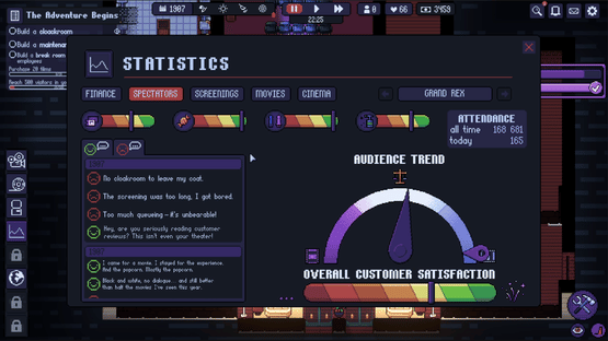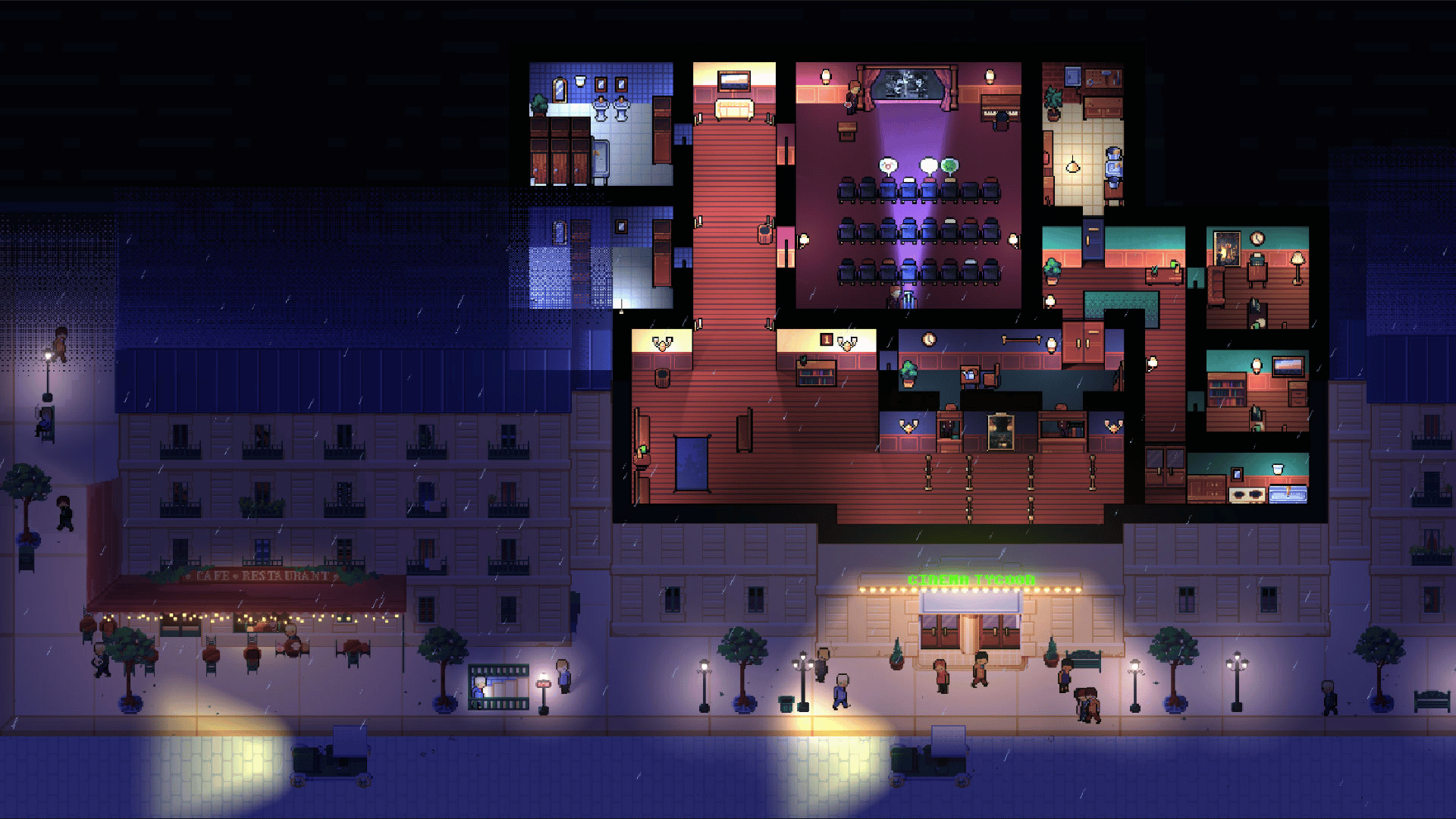 Tycoon game where you manage your movie theater through more than 100 years of history. Build and customize your cinematic empire without being overtaken by the evolution of the 7th art.