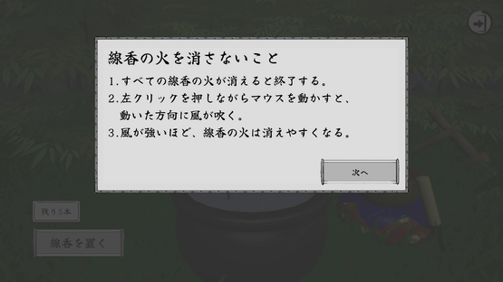 You must not extinguish any of the incense sticks. This is the only rule in this game. You can continue playing for longer by controlling the wind direction and timing when to add new incense sticks. When all the incense sticks are extinguished, the game ends.