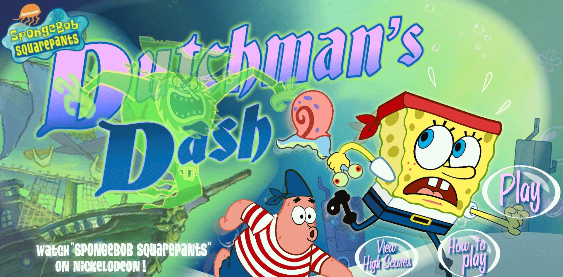 A SpongeBob SquarePants flash-based platformer game where the player, either using SpongeBob or Patrick, must go through 9 levels to fight the Flying Dutchman and save Gary.