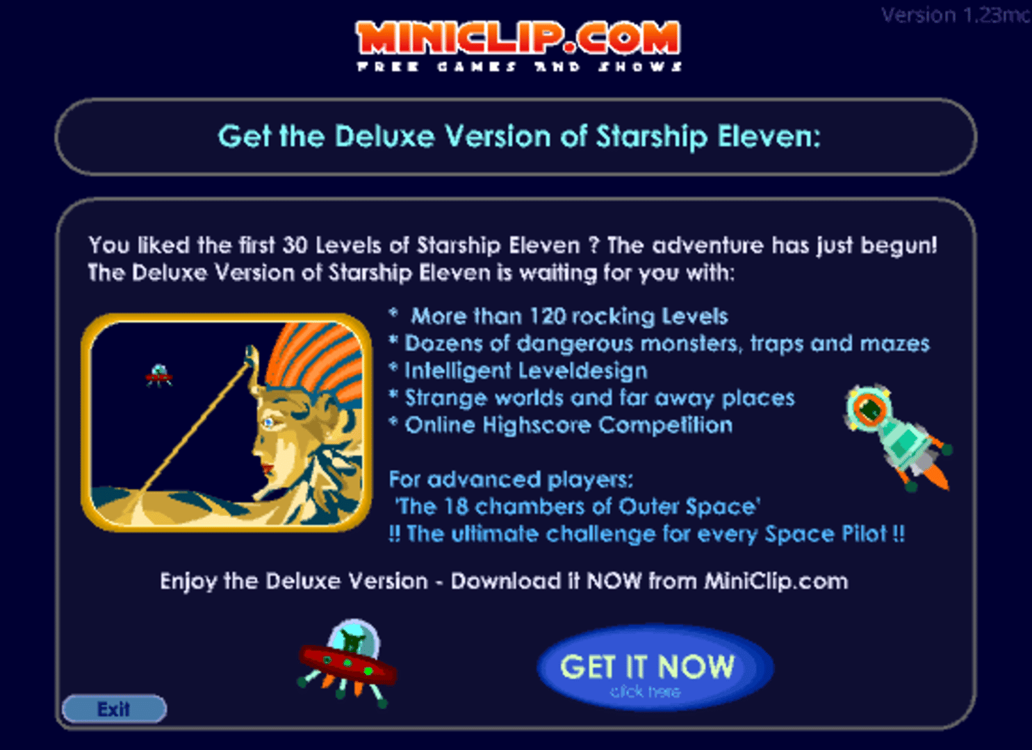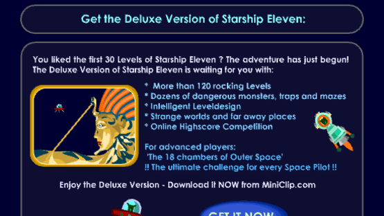 "Starship Eleven" - The enlightening sequel to our blockbuster "Starship Seven". Choose one of two exciting different space ships and explore new worlds and strange places in more then 120 rocking levels.