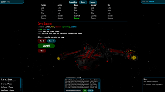 Quintet is a co-operative, cross-platform, multiplayer sci-fi game where players control the same ship through 5 roles - Captain, Helm, Tactical, Engineering & Science. Battle with other player crews over the Internet or LAN.