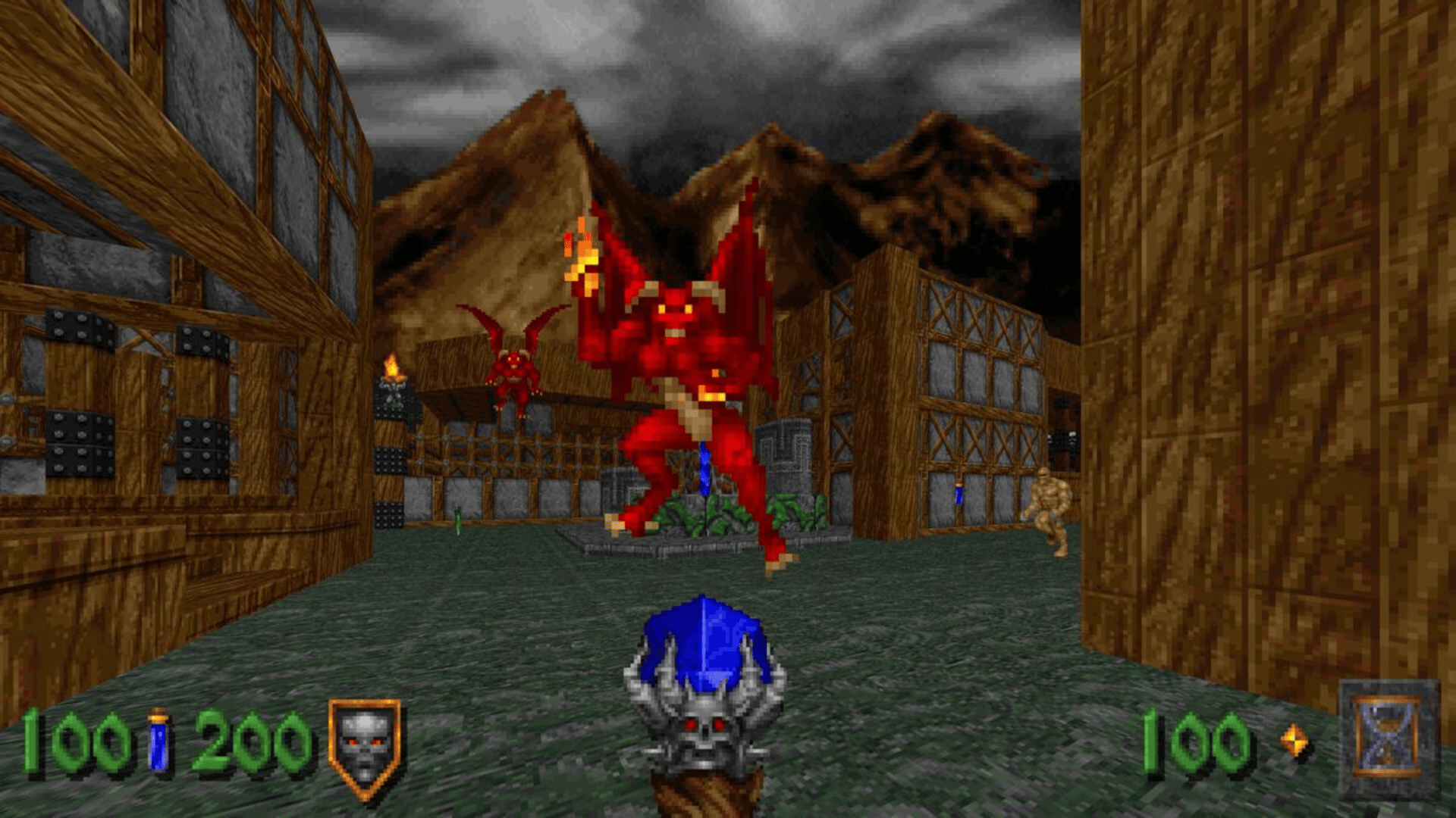 Years after the planes were cleansed of D'Sparil's wretched influence, a wandering warrior in search of home arrives at a foreign land to discover the blighted stains of that old time religion seeping through the cracks of society once more. In the fortified city, zealous acolytes stand high atop a decadent cathedral and listen to the lamentations echoing from the streets as non-believers are dragged away for 'correction.' The shadow of D'Sparil lingers after death, his absence attributed to apotheosis. Once revered, now worshipped, deserving of neither. An all-too-familiar scene, and one you simply cannot stomach. Taking up the mantle of Heretic once more, you stride into the city, staff in hand, to silence the echoes of your arch-nemesis.