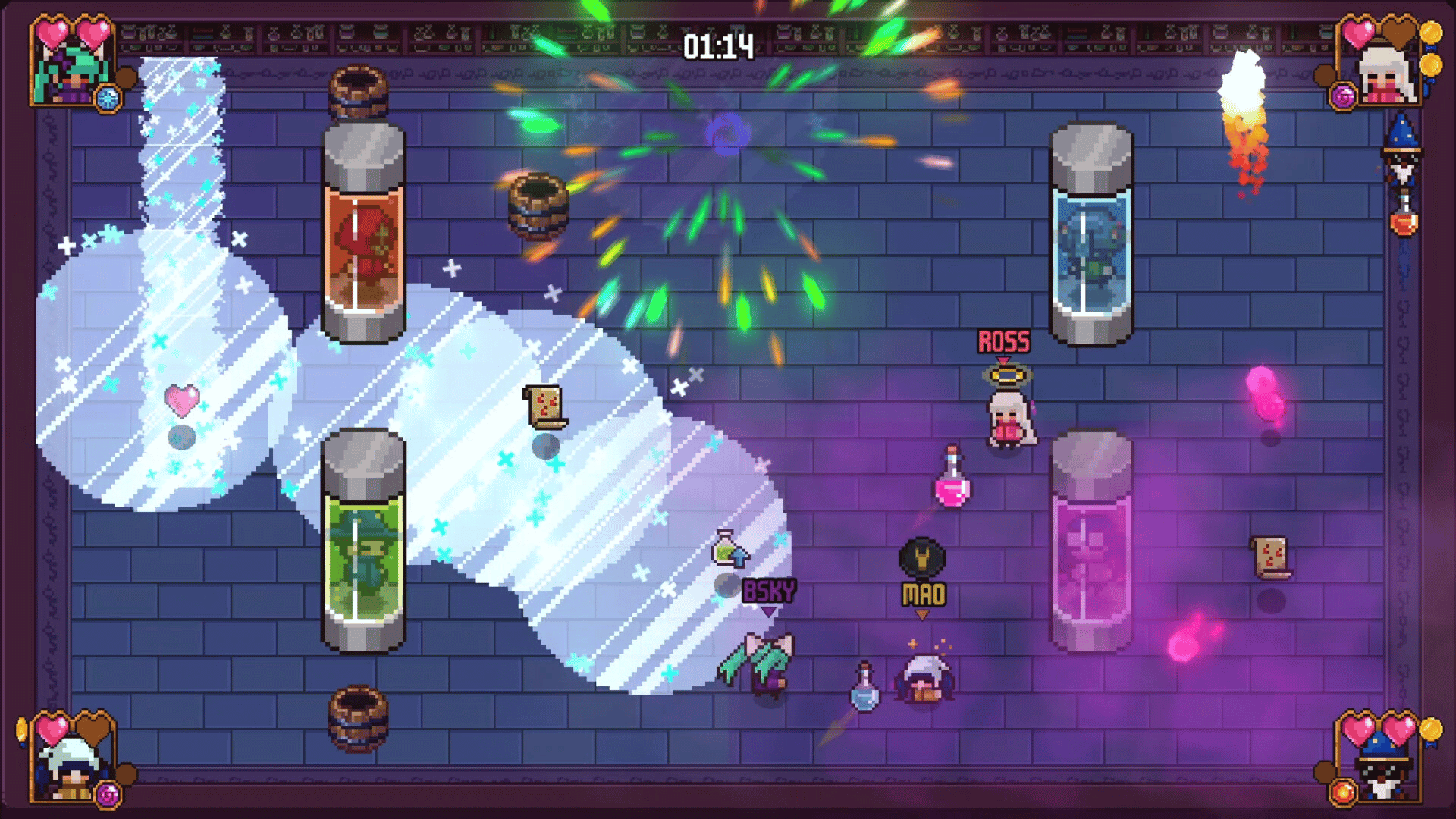 Chaos reigns as up to 4 friends battle in a magical, explosive local-multiplayer showdown. Create your wizard, choose your magical affinity, mix elements, and craft explosive potion bombs to dominate the arena. Even in defeat, haunt and sabotage rivals as a ghost, seizing a second chance at glory.