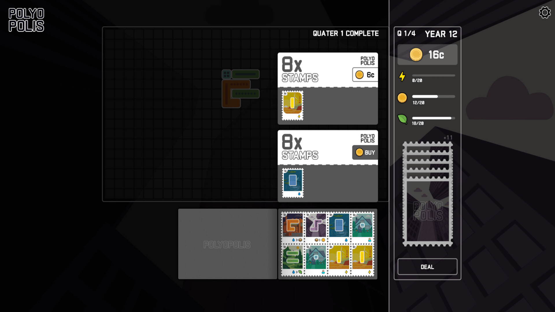 Stamp out a thriving city by fitting shapes into a ever-changing grid to attain the most resources. Chain buildings to boost energy, people and products, gain gold coins, and unlock rare stamps in this zen-meets-strategy city builder.