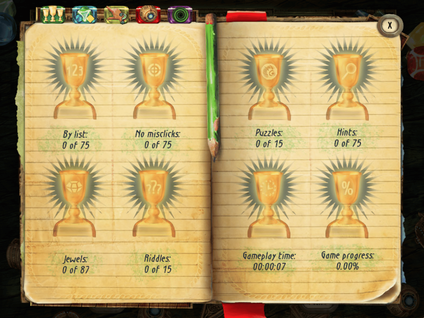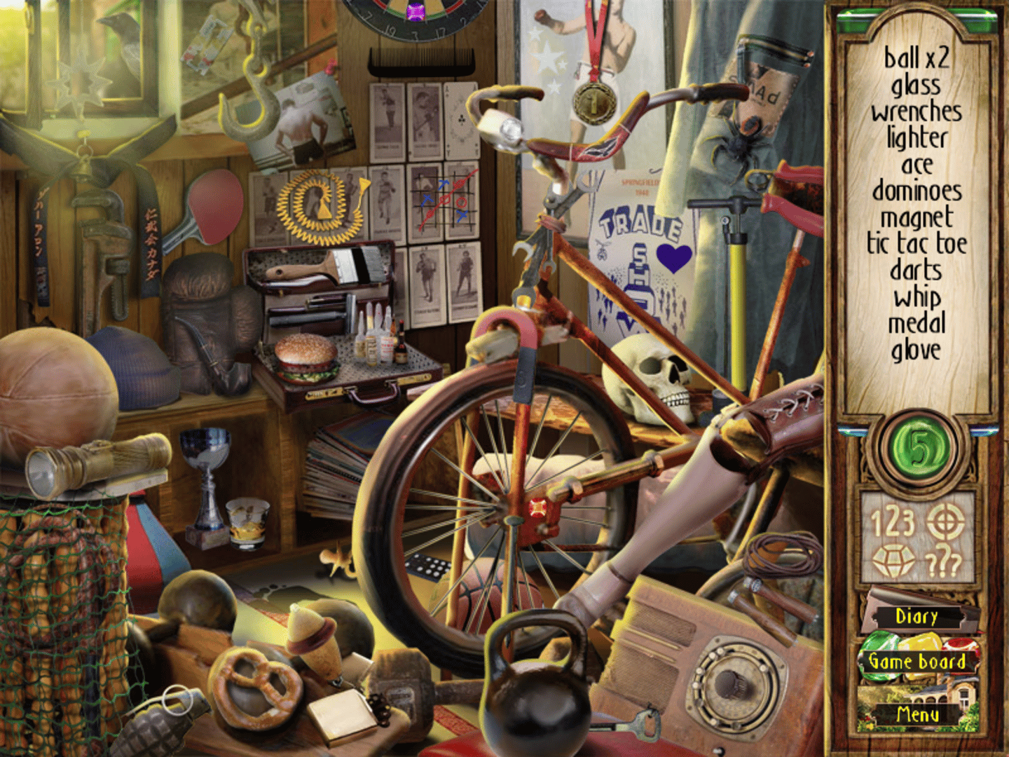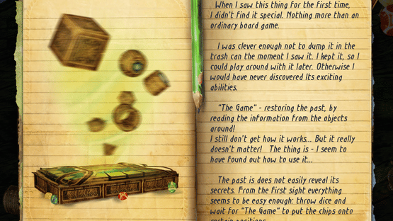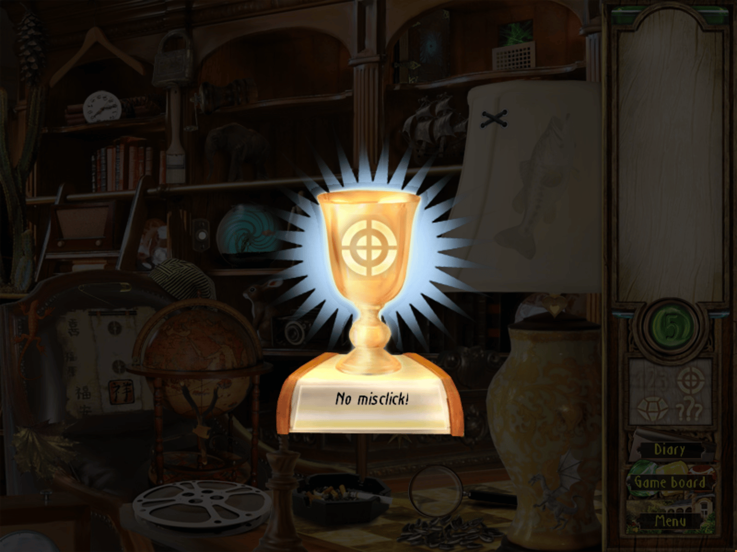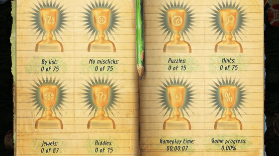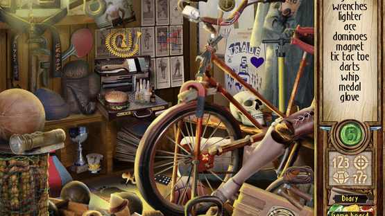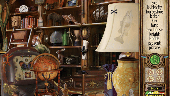 Time Riddles: The Mansion is a hidden object game where most of the time, the objective is to find and click on all the items listed at the right side of the screen, on locations selected after throwing dice on a board game. The player assumes the role of the main character, playing a mysterious board game where objects have to be removed from scenes taking place on the mansion and its surroundings, to uncover its secret past. Each location has four optional awards, received after collecting all the six jewels, finding the list objects in order, avoiding wrong clicks and solving a riddle to find a special item. The hint button is a green jewel set below the list, showing the position of one of the required objects when activated. There is a maximum of five hints available, with extra ones received after completing the tile-matching mini-game at the end of each chapter, where the player has to swap pairs of adjacent tiles to create lines or columns of three or more of the same type and make them disappear.