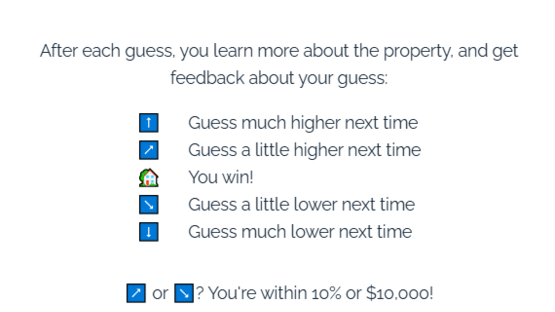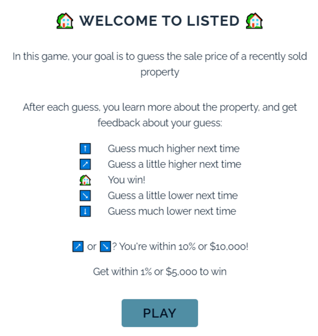A daily guessing game where players aim to correctly identify the price of a recently sold property. Each incorrect guess provides feedback if the guess was higher or lower, as well as revealing more information about the property.