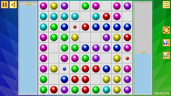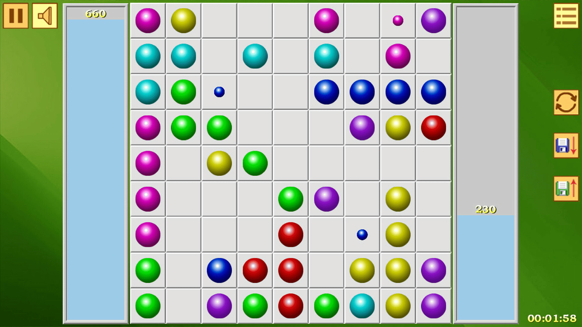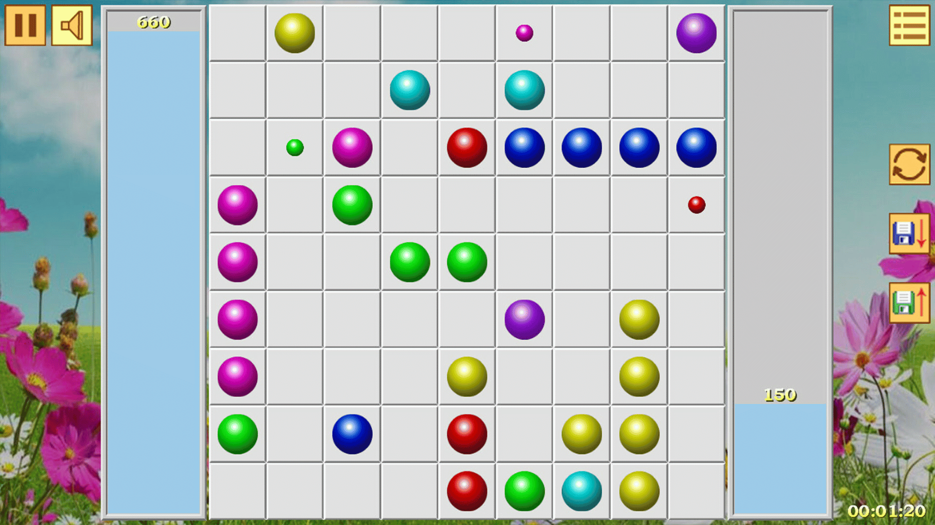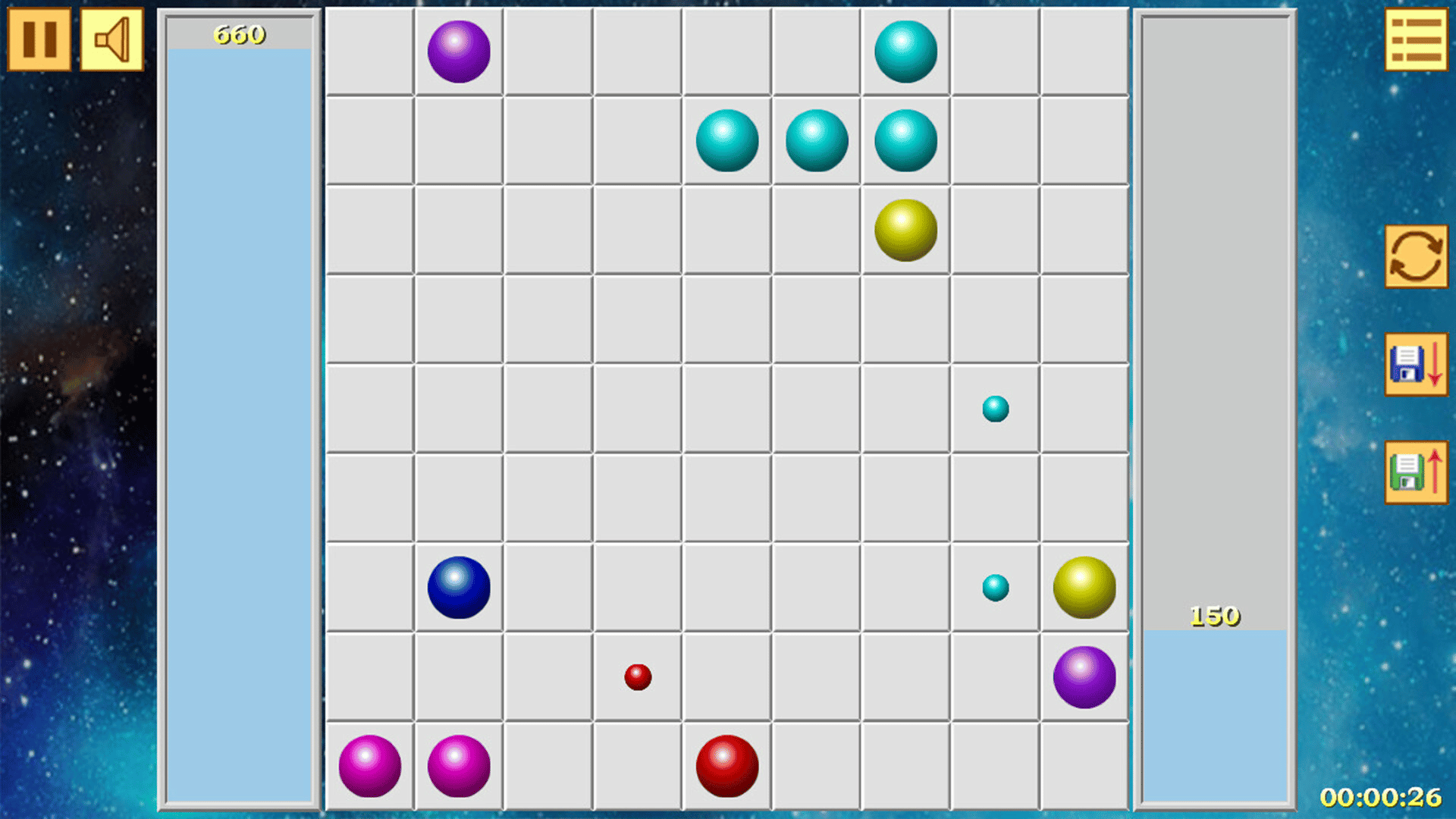 Remove the balls from the field by making lines. Make lines of five or more balls of the same color. The more balls in a line, the more points you get.