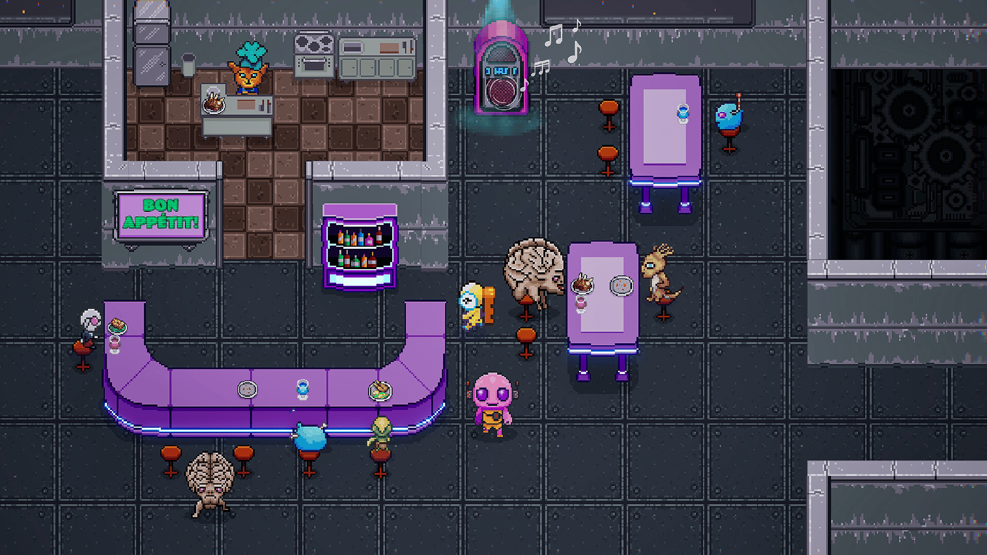 Ginga Cantina is a casual sci-fi adventure RPG that blends top-down hunting and gathering with cantina management. Hunt exotic creatures on a vibrant alien planet by day, then cook and serve them to a quirky cast of cosmic customers by night to build the galaxy's most renowned cantina.
