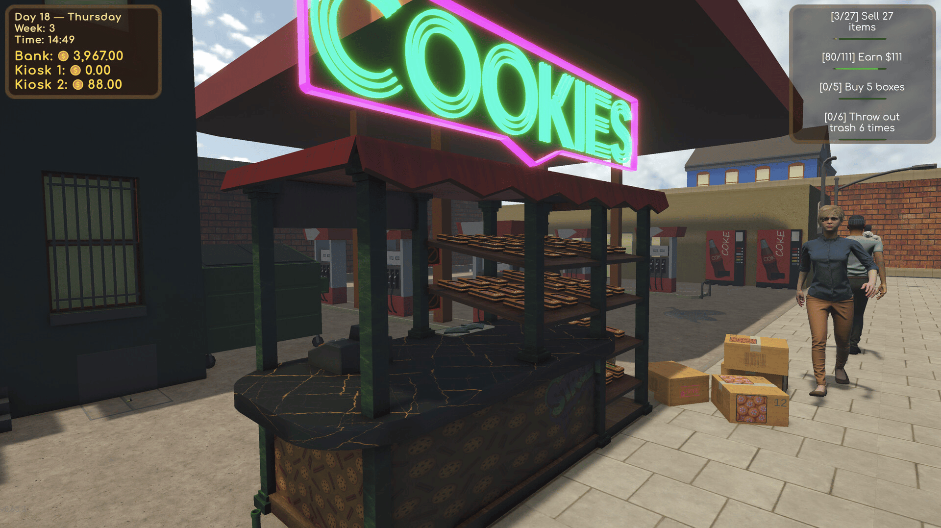 Manage chocolate and cookie kiosks. Restock shelves, handle queues, complete tasks, upgrade your storage, and research new flavors. Fulfill B2B orders — or take the risk of illegal trade and lose everything.