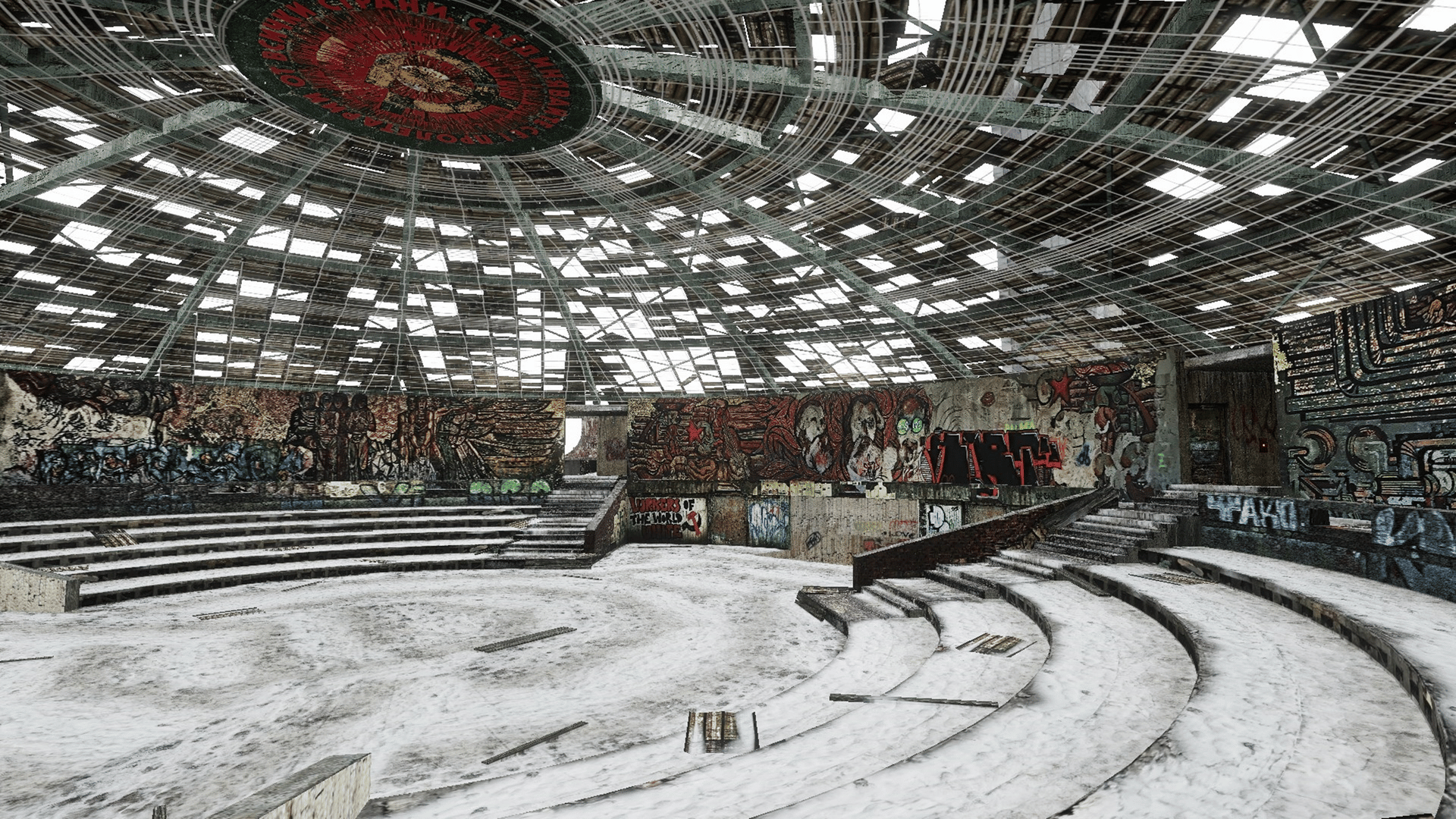 The game is the abandoned monument of Buzludzha and the game included a winter season of atmosphere as real. You have to look for some buttons and an exit.