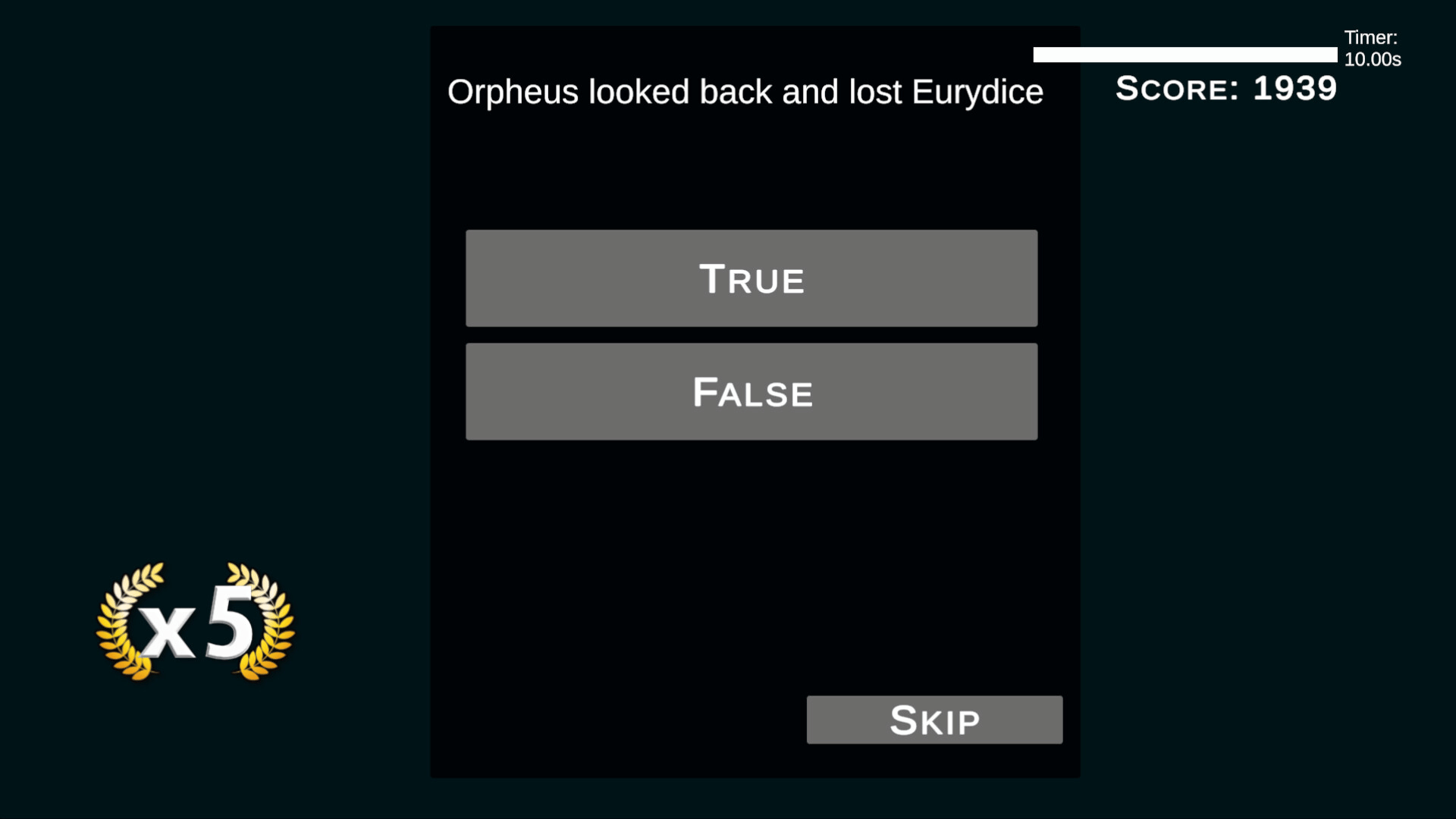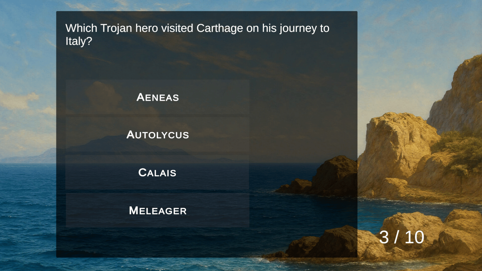 Explore the mythic tapestry of ancient Greece through immersive quiz-based gameplay. Test your knowledge of gods, heroes, and epics sagas in four distinct modes—including Speed Mode, with Steam Leaderboards. Contains 530 handcrafted questions, 160 AI-enhanced illustrations.