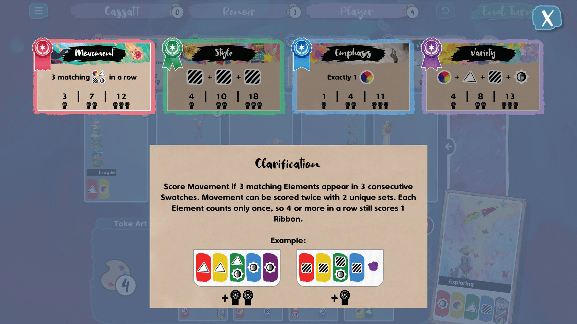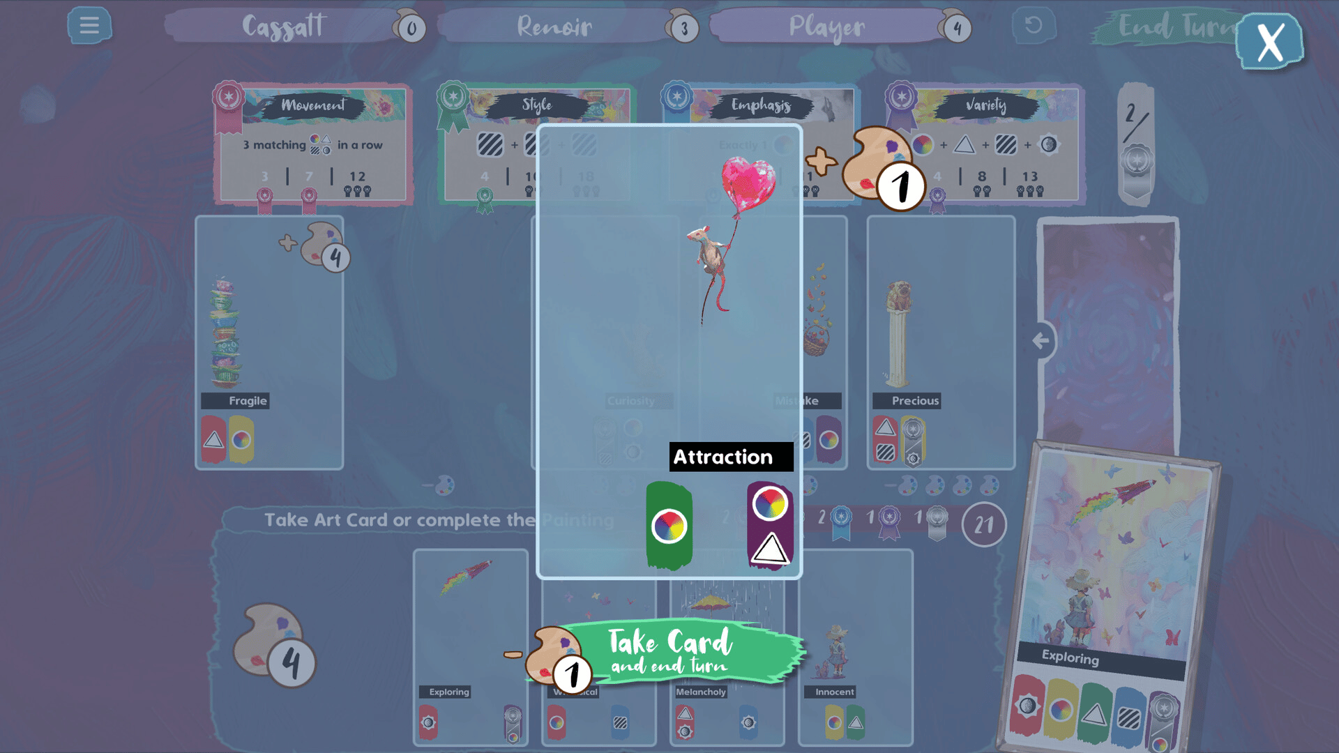 Create stunning paintings, layer cards strategically, and score ribbons in Canvas - a digital board game where art meets strategy. Choose and combine Art Cards to create beautiful paintings and enjoy a mix of artistic expression and tactical gameplay.