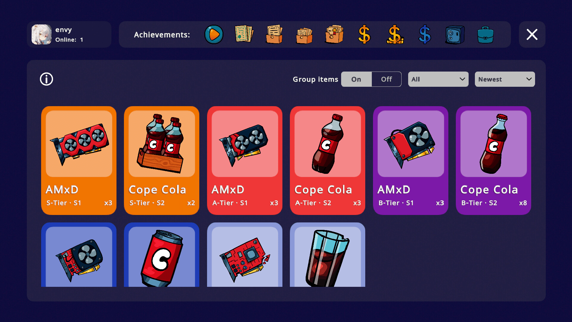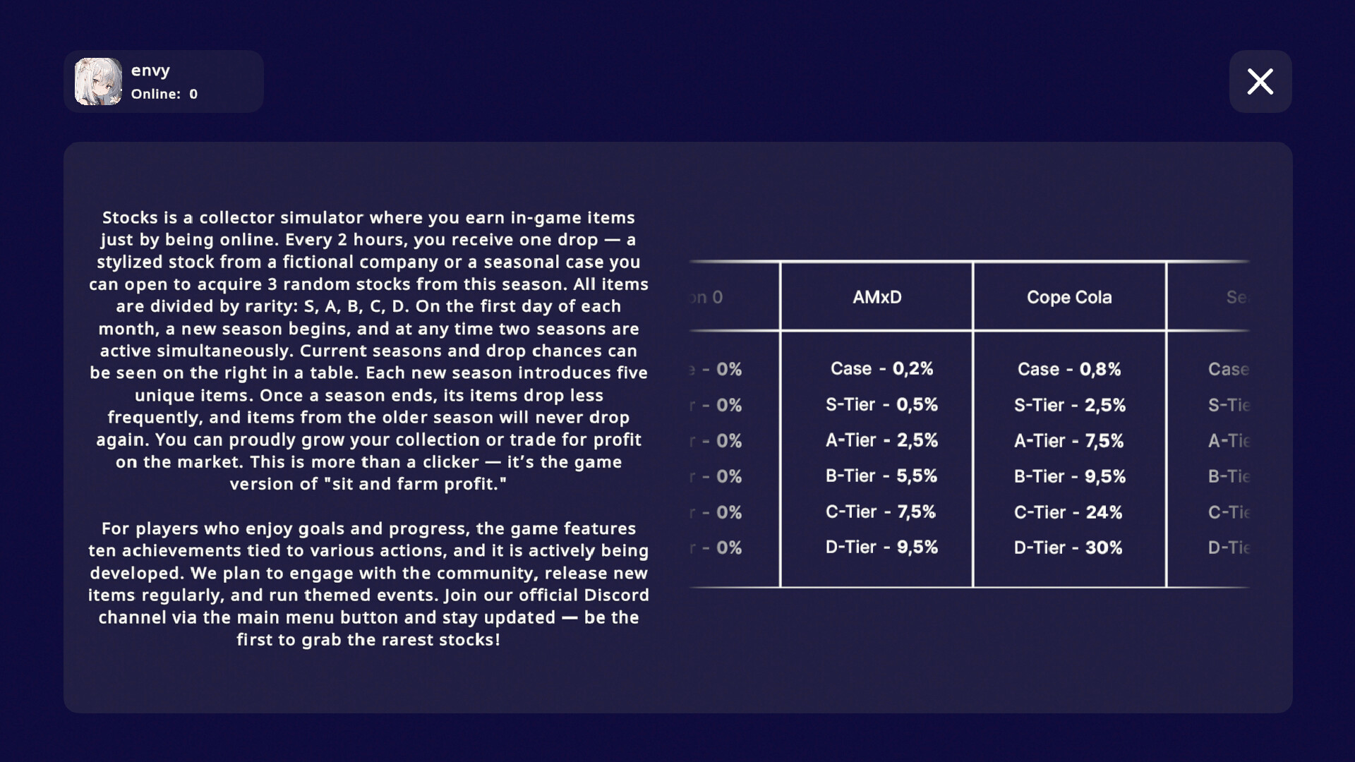 A collector simulator and clicker where you earn rare items just by staying in the game. Collect stylized company “stocks,” track their value, join seasonal updates, and profit!