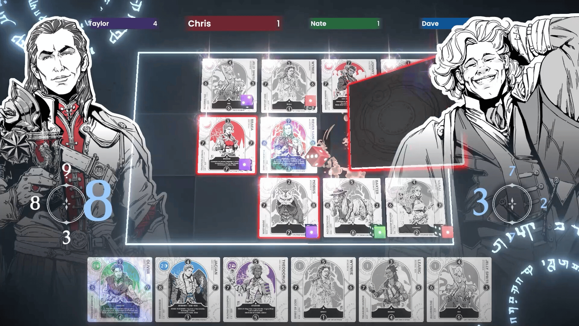 A fast-paced, grid-based, card-flipping tactical CCG for up to 4 players! Archetypes and team Dynamics bring powerful abilities to move, defend, swap, or reorient cards. Capture the board and flip your way to victory!