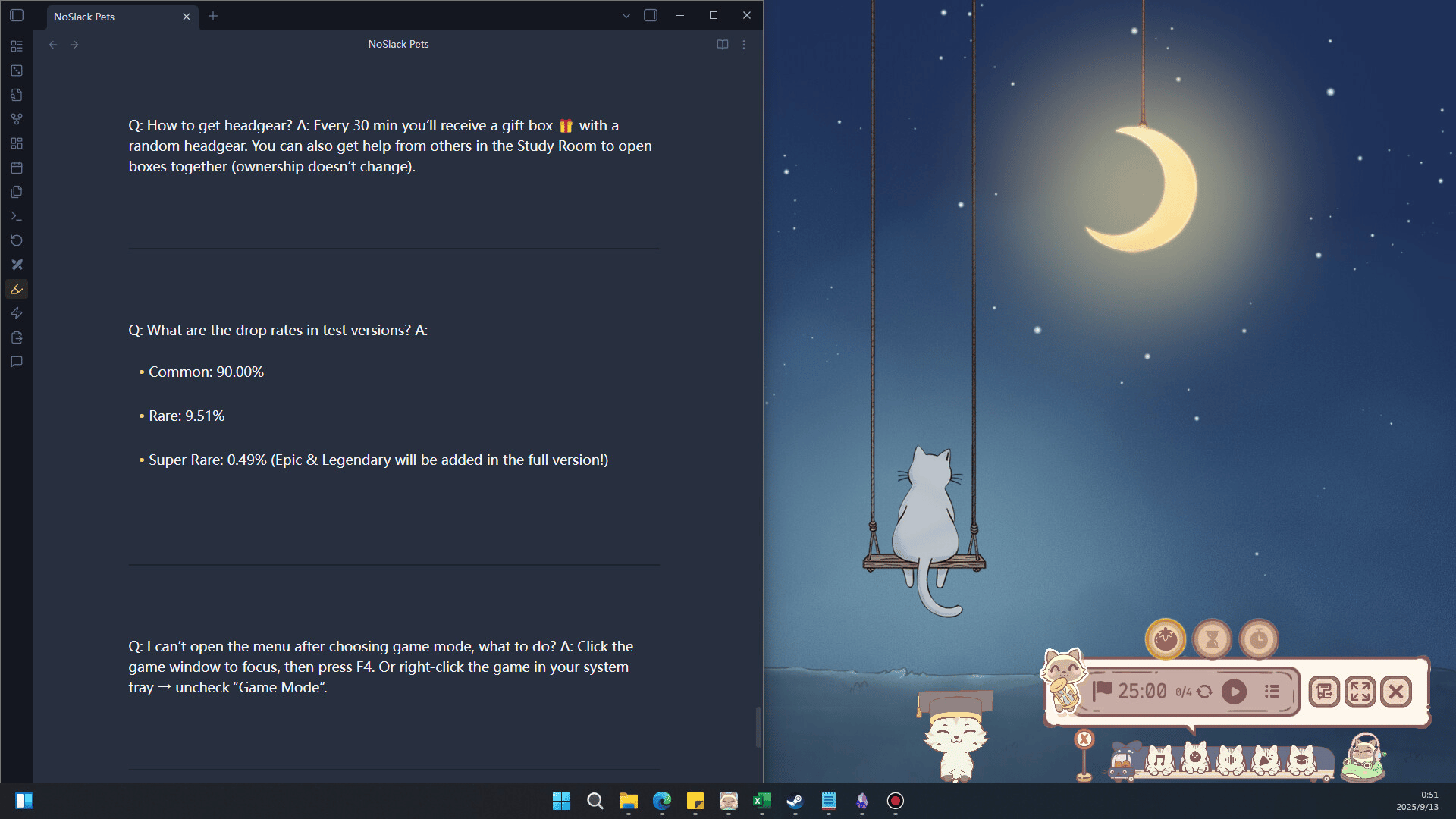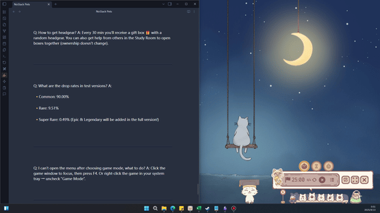 No Slack Pets is a desktop idle game where your cute cat companion joins your daily work, study, and chill time. Enjoy collecting over 300+ adorable headgears, customizing your DIY room, and focusing better with Lo-Fi white noise and a built-in Pomodoro timer—fun, chill, and full of surprises!
