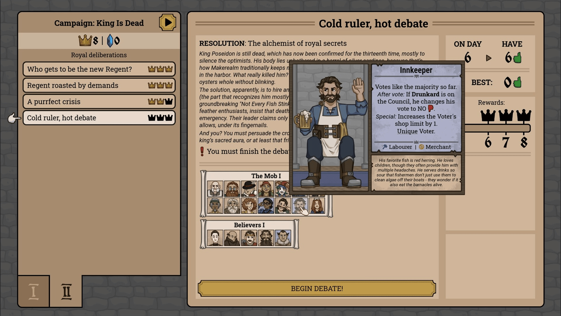 The king is dead! Tame chaos in this unconventional strategy with autobattler and puzzle elements, set in a fantasy setting. As the King's Regent, manage your Councilors so that they vote accordingly to your will. Manipulate, trigger synergies and win debates!