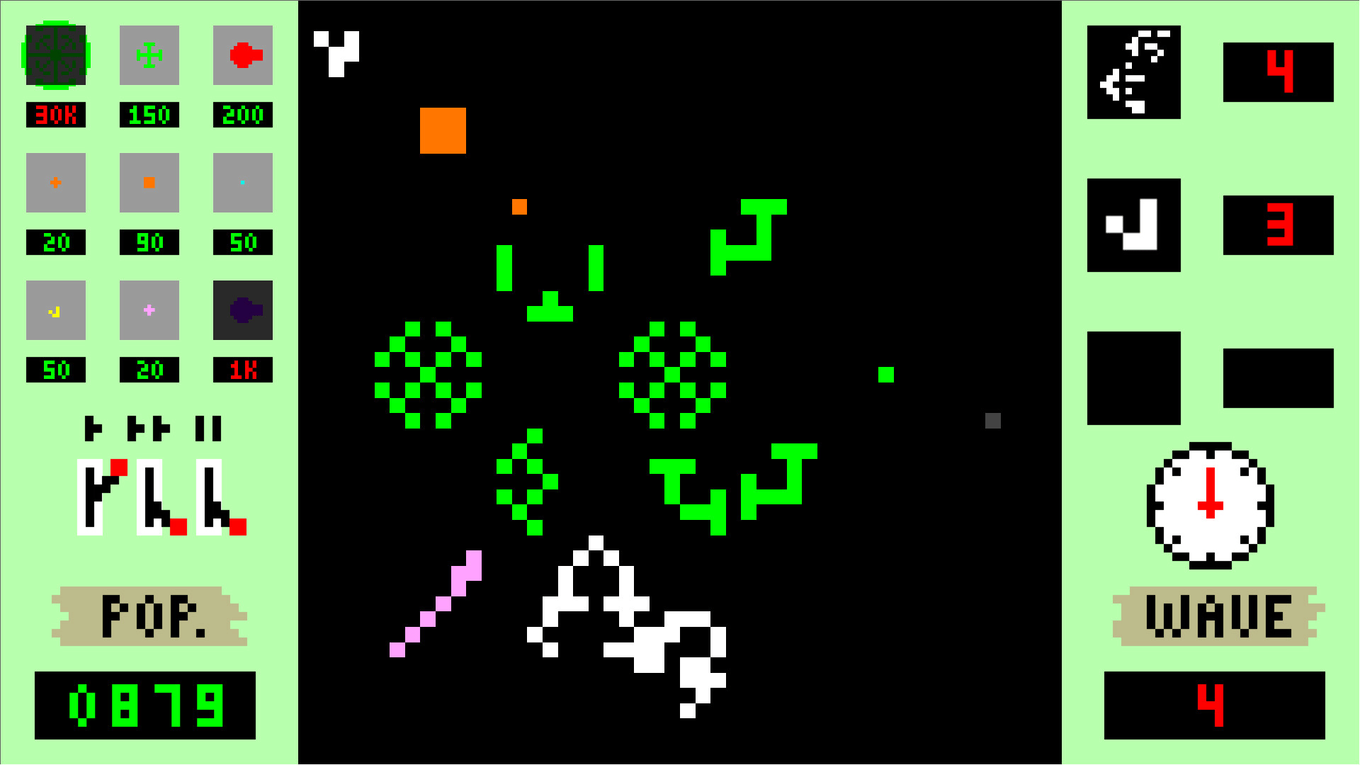Spaceships and Cellular Automata is a tower defense game set in space! Place different towers to defend your ship against the waves of aliens. The enemies are simulated based on Conway's Game of Life. Even just one of your bullets is enough to cause a destabilizing chain reaction to destroy them!