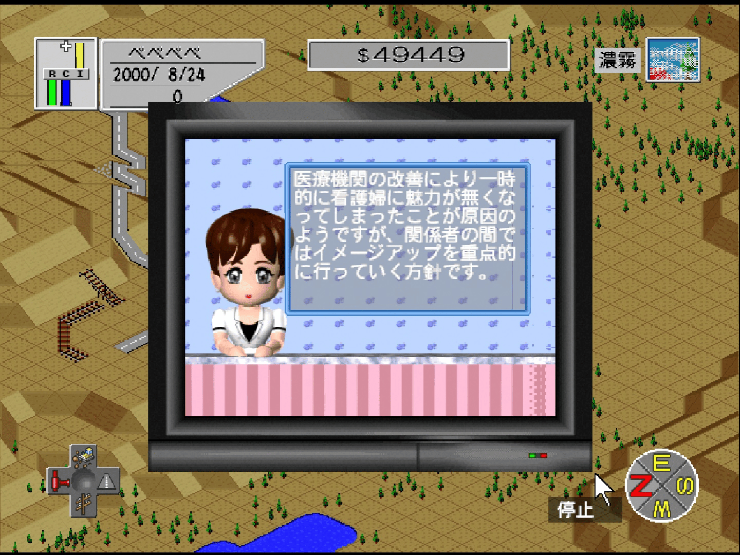 A Japan-only release of SimCity 2000 for the Nintendo 64 on January 30, 1998, produced and published by Imagineer Co., Ltd. It featured some additional features, mainly mini-games, a dating game, TV to replace the newspaper, horse races and monster breeding, among others, all of them in 3D. A few new "natural" disasters were also included, most of them being giant monster attacks (players were able to use their monster to fight against them).