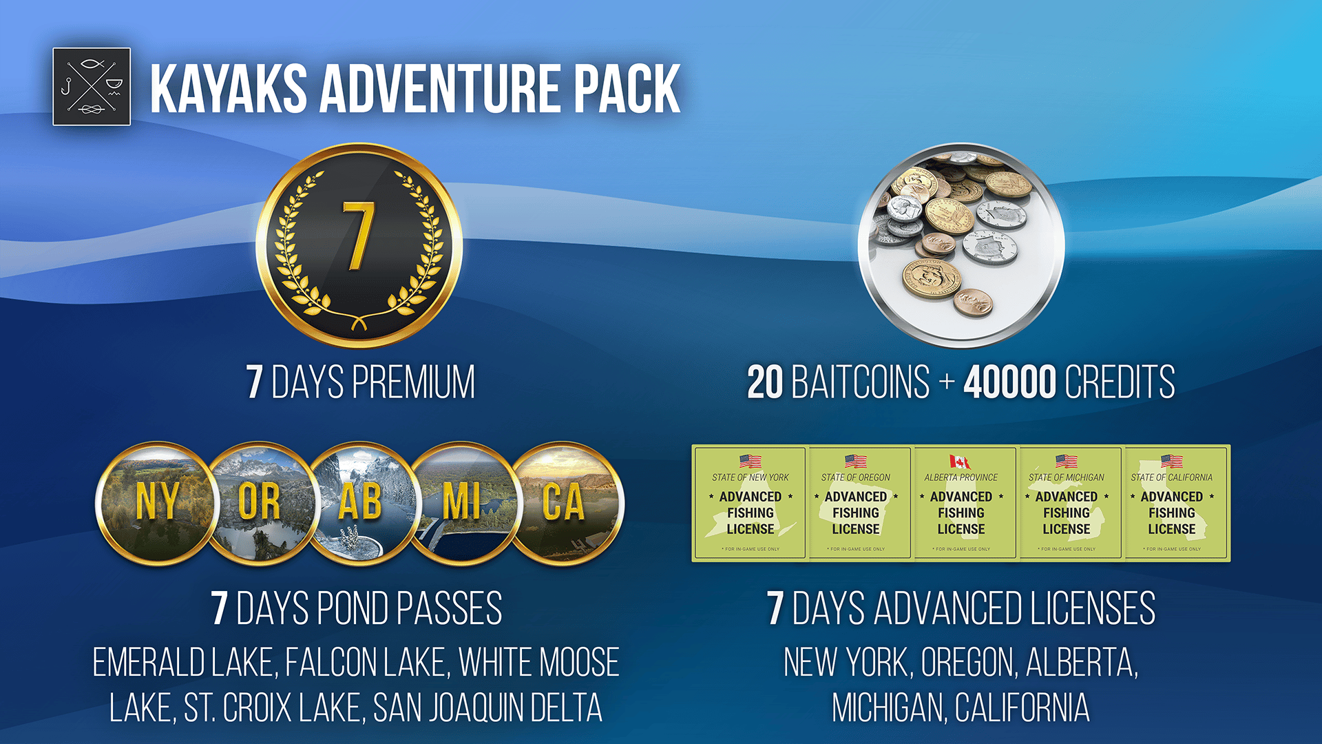 Kayaks Adventure Pack is a full set of three awesome angling companions - each with its own unique characteristics! Kayaks Adventure Pack also includes cool stuff like Credits, BaitCoins, 7 days of Premium Account and Advanced Licenses.