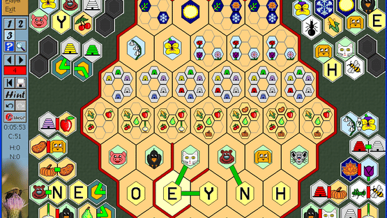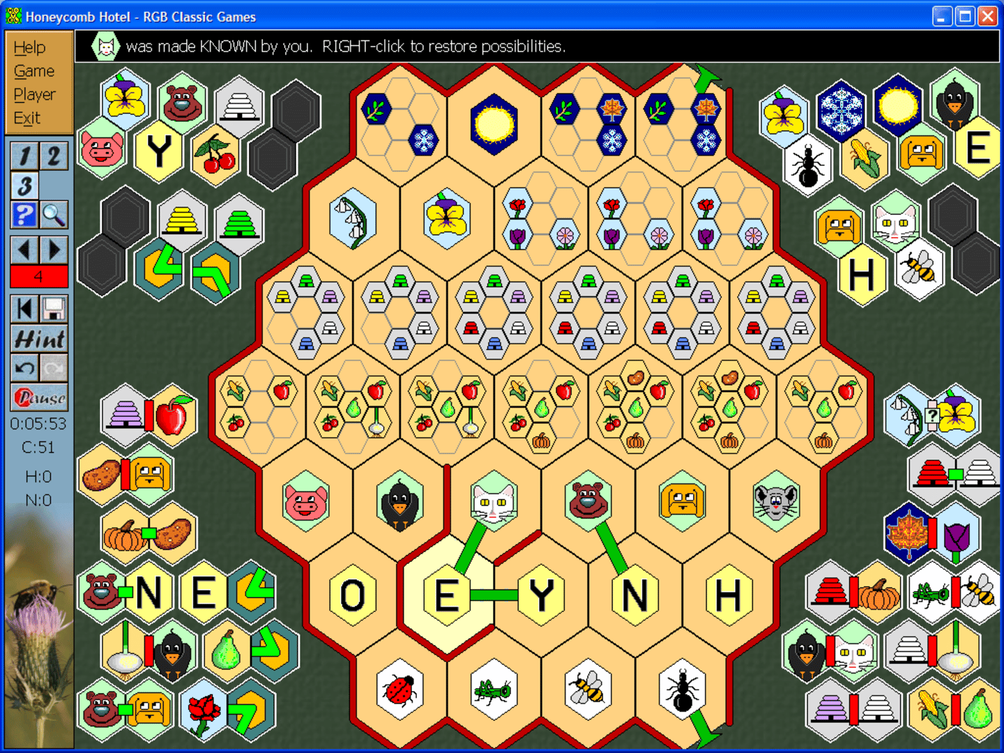 Honeycomb Hotel is a game of logic and deduction. It provides over 65,000 puzzles in each of small, medium, and large sizes. The goal of each puzzle is to determine the placements of images within the honeycomb (up to 37 different cells on the large puzzles) and to determine the exact path that runs through each cell of the honeycomb. You're provided with sufficient clues (presented graphically) to determine all of this, using clear, cold, precise logic. Are you up to the task, or are you too buzzy?