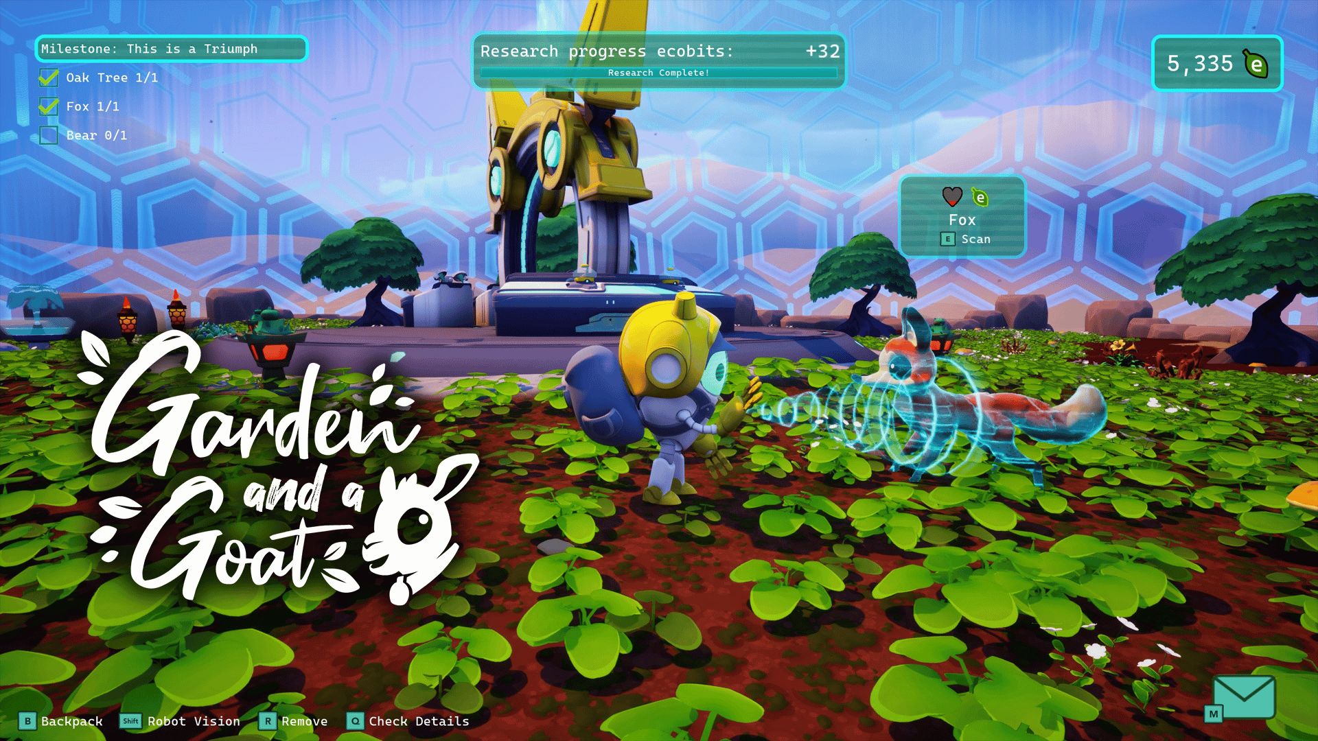 Garden and a Goat is a single player, casual, animal collecting and gardening game. Your robot is introduced to a series of ecosystems in need. You'll clean up the environment, revive the plants, and entice the local wildlife to return, unlocking ever more animals and decorations along the way!