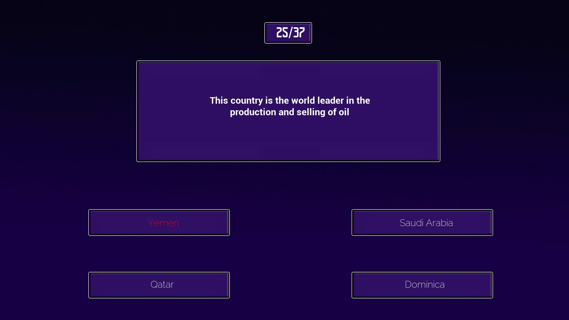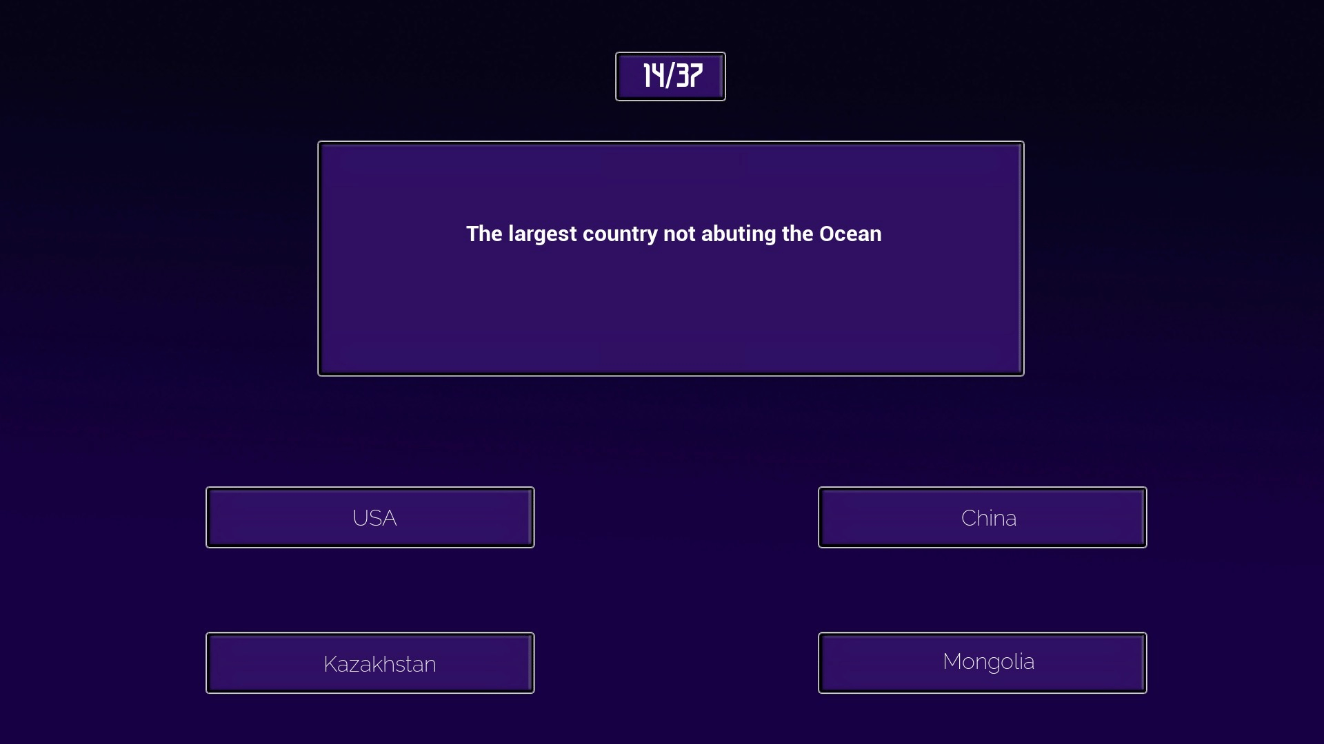 Easy quiz game to test your knowledge about countries!! Guess flags, facts and other things about countries and expand your knowledge of other countries!! For each right answer you will get 40 Steam Achievments!! P.S. On the beginning there are only 100 Achievements Available, but if you help us downloading and playing our game it number will increase up to 1500!!