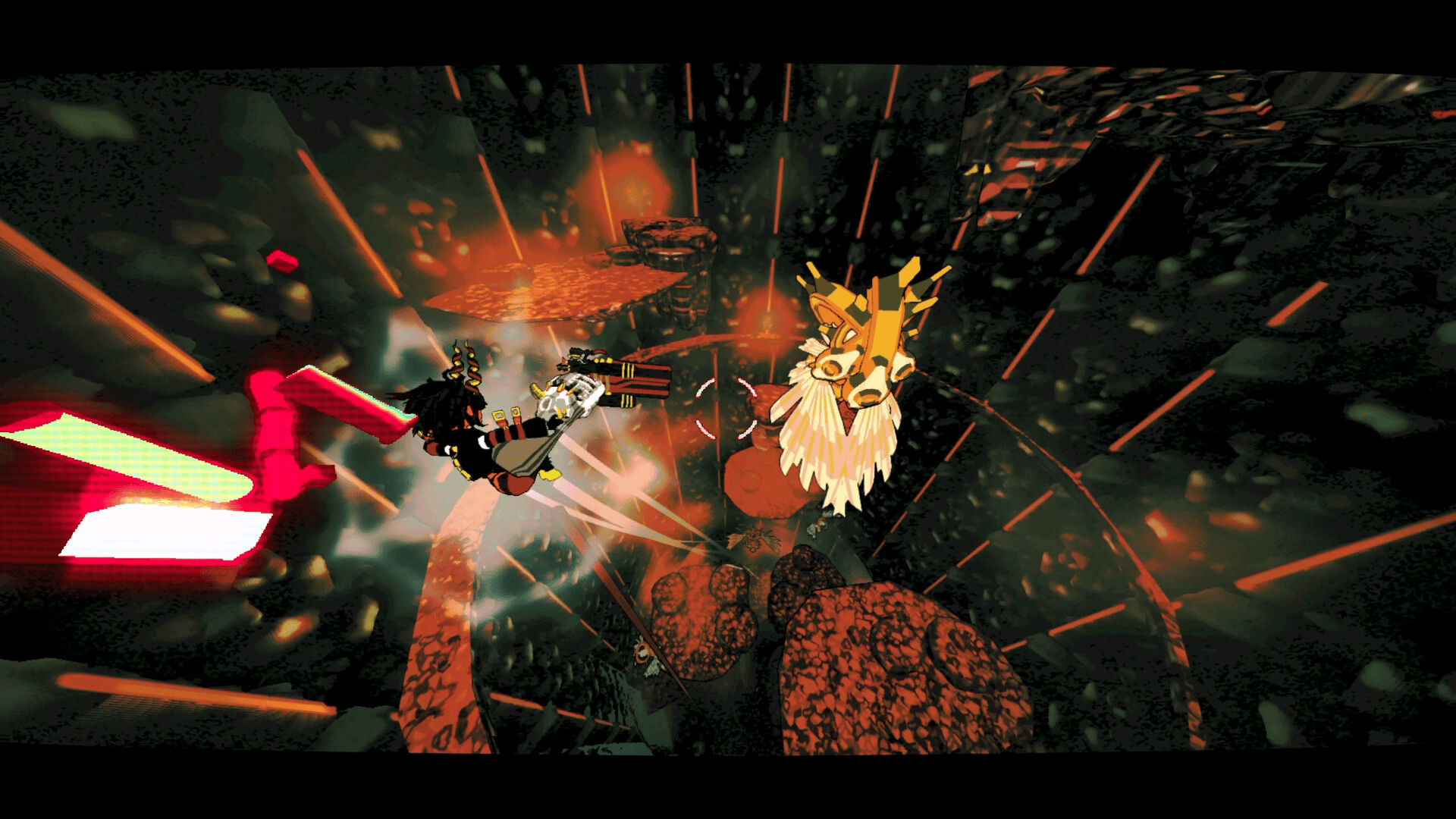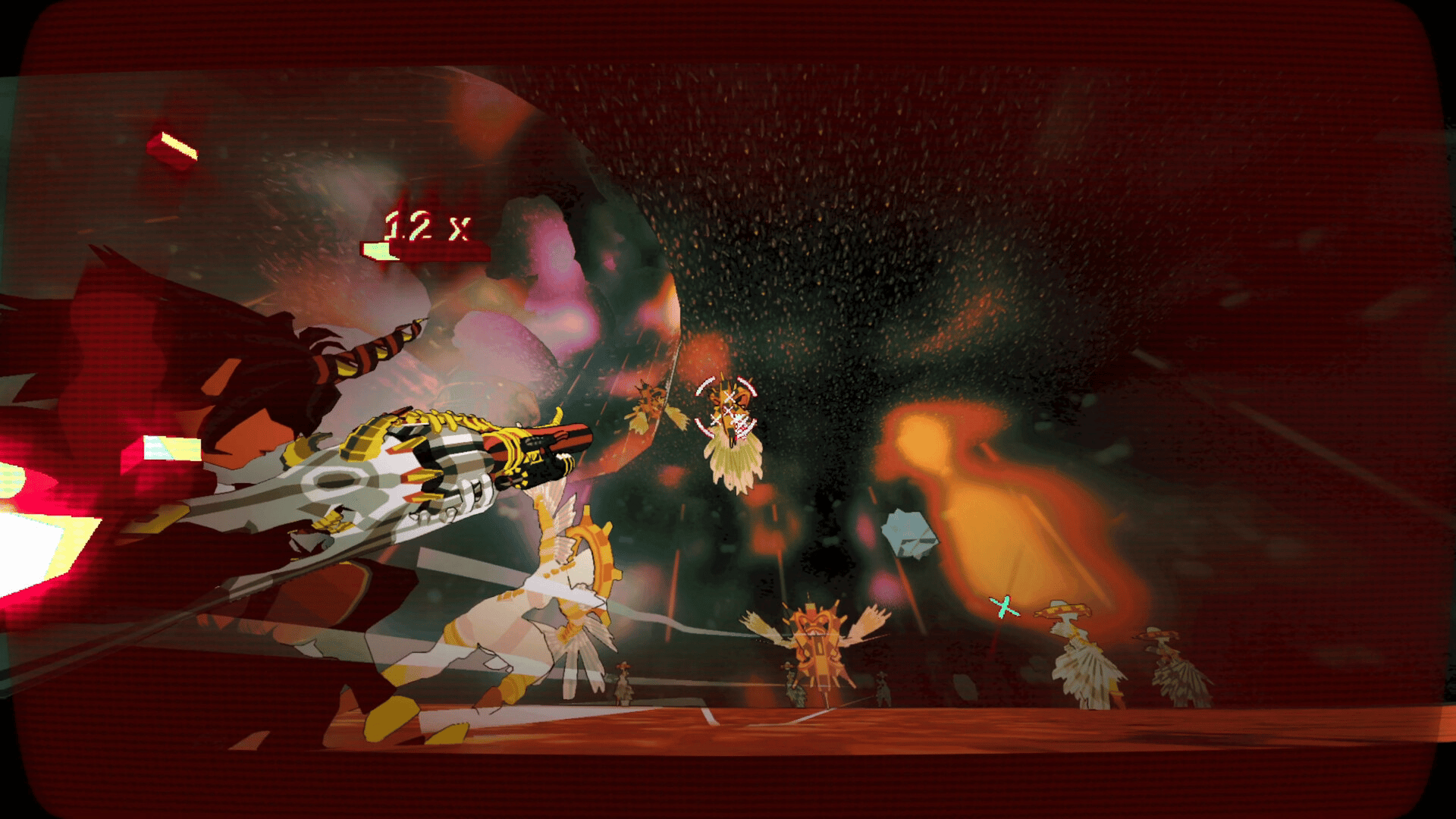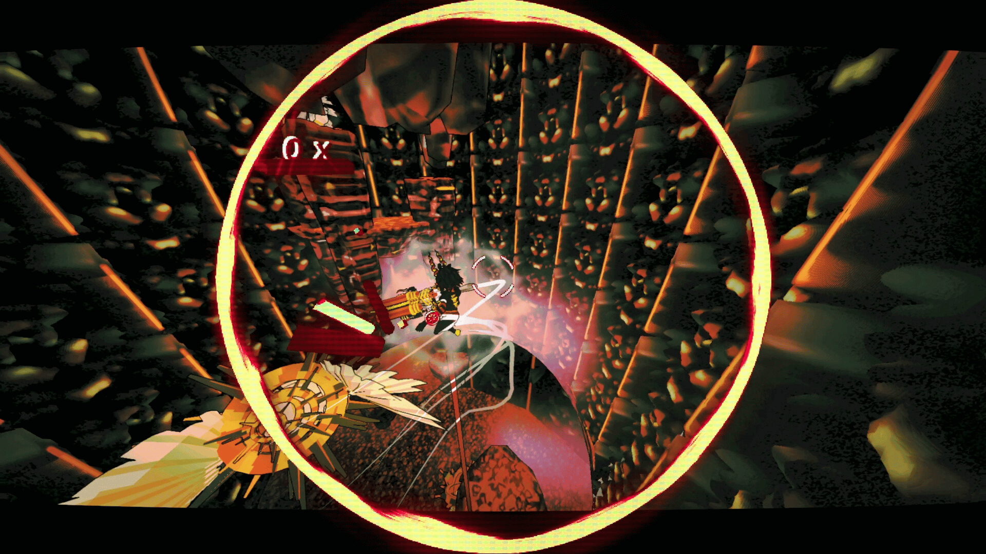 Auto-duplicating Angel Forces swarm through the never-ending Hell Rod. A tiny demon free-falls her way to the bottom, mowing angels down as her demise looms closer.