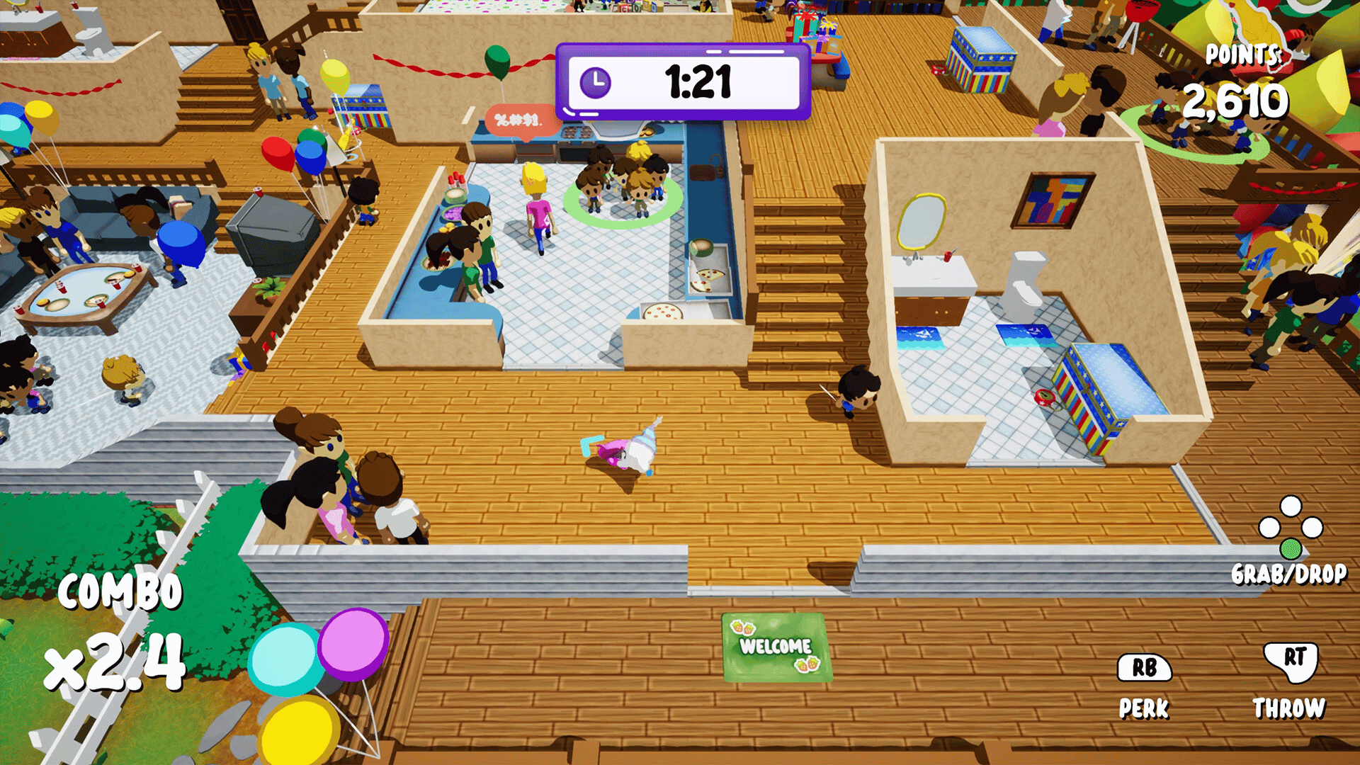 Where's that Clown is a frantic top down arcade game where you must keep impatient kids entertained throughout chaotic birthday party venues. Dash around, dodging toddlers and parents as you try to get the highest score!