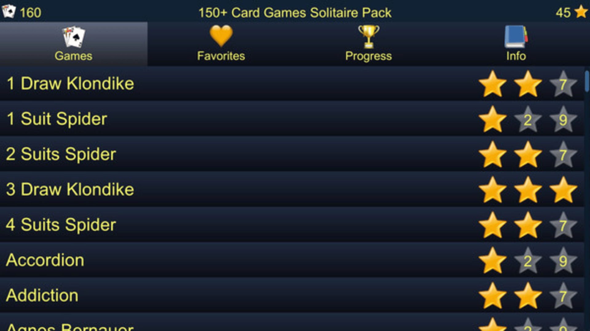Play over 150 different solitaire card games, including popular classics such as Klondike, Spider, Freecell, Pyramid and many more. Enjoy playing your favorite games and learn new ones with rules provided for every game. Customizable backgrounds, card designs and win animations.