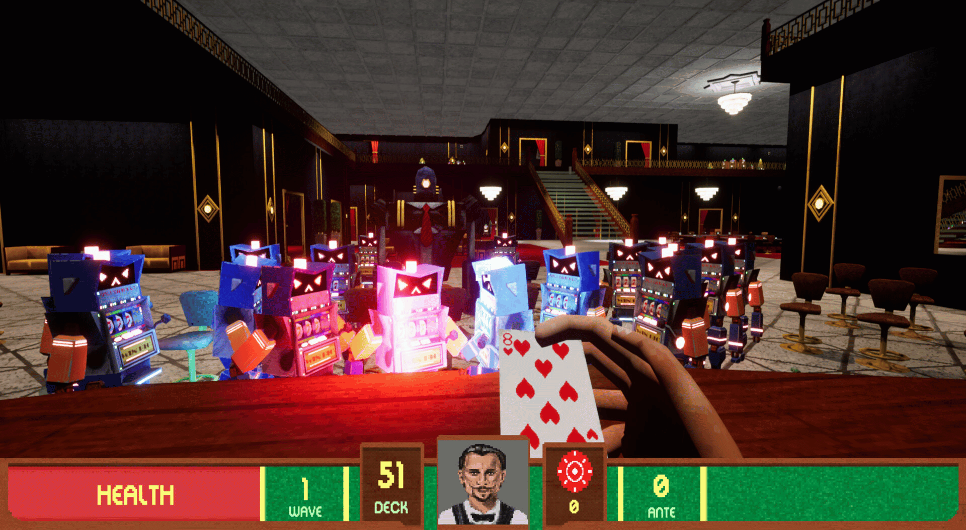 Double Down is a roguelike FPS for high-octane high rollers. Smash robots and spin slots to win powerful upgrades, and make your way through growing waves of enemies to face The House and take back the casino.