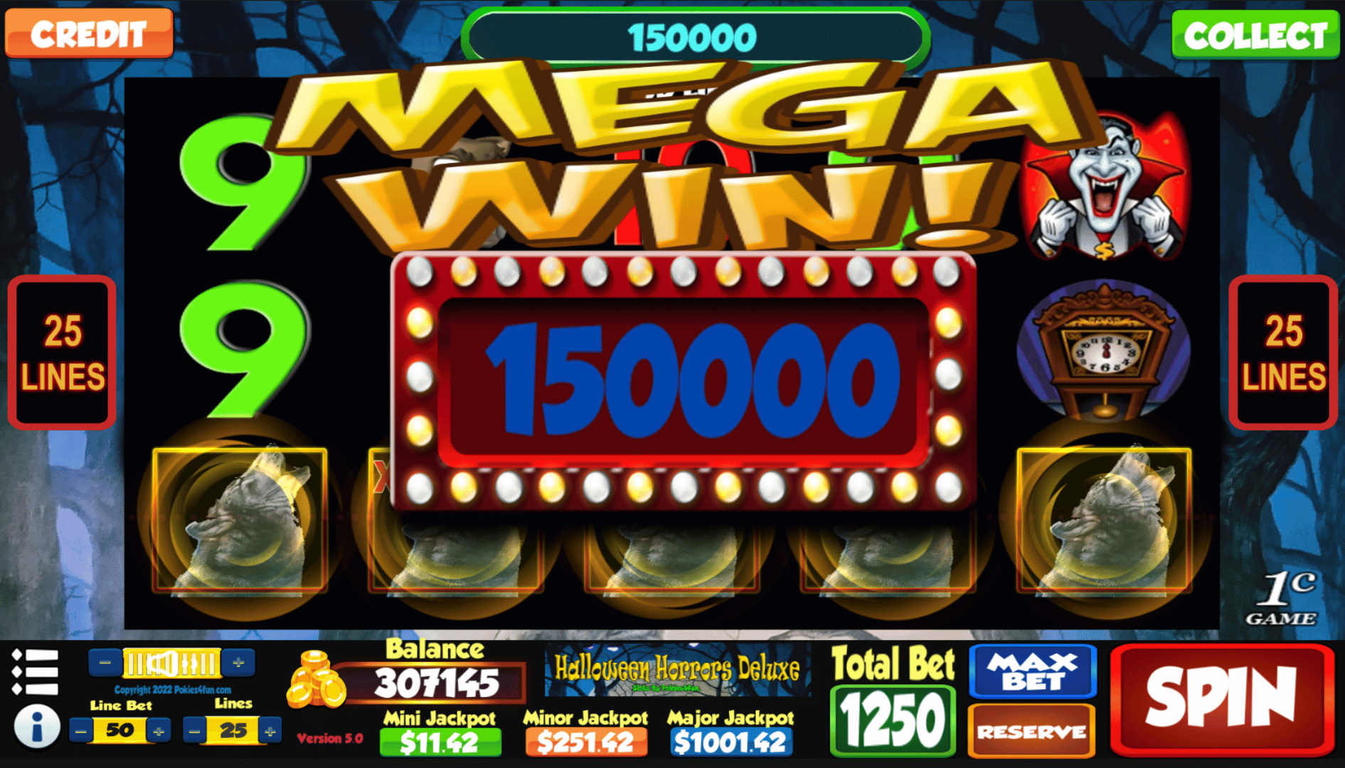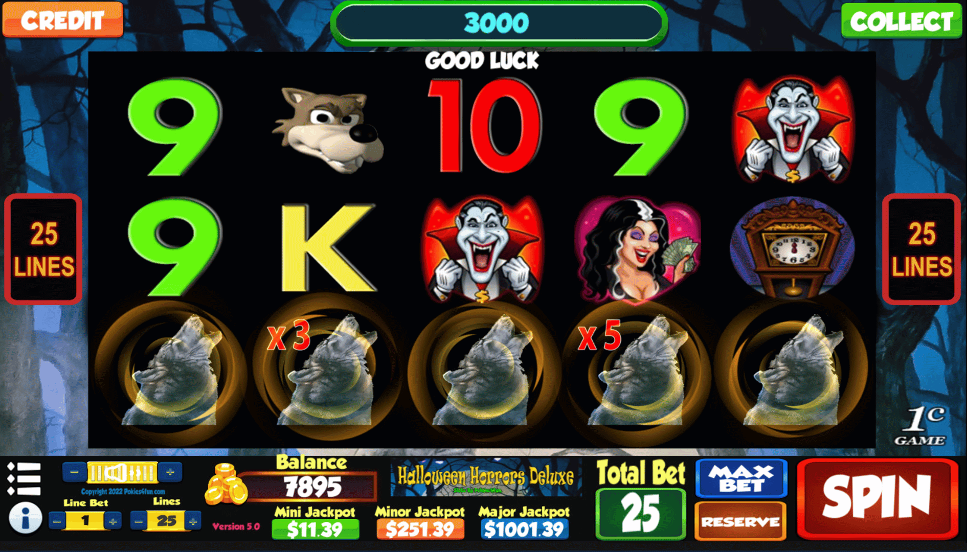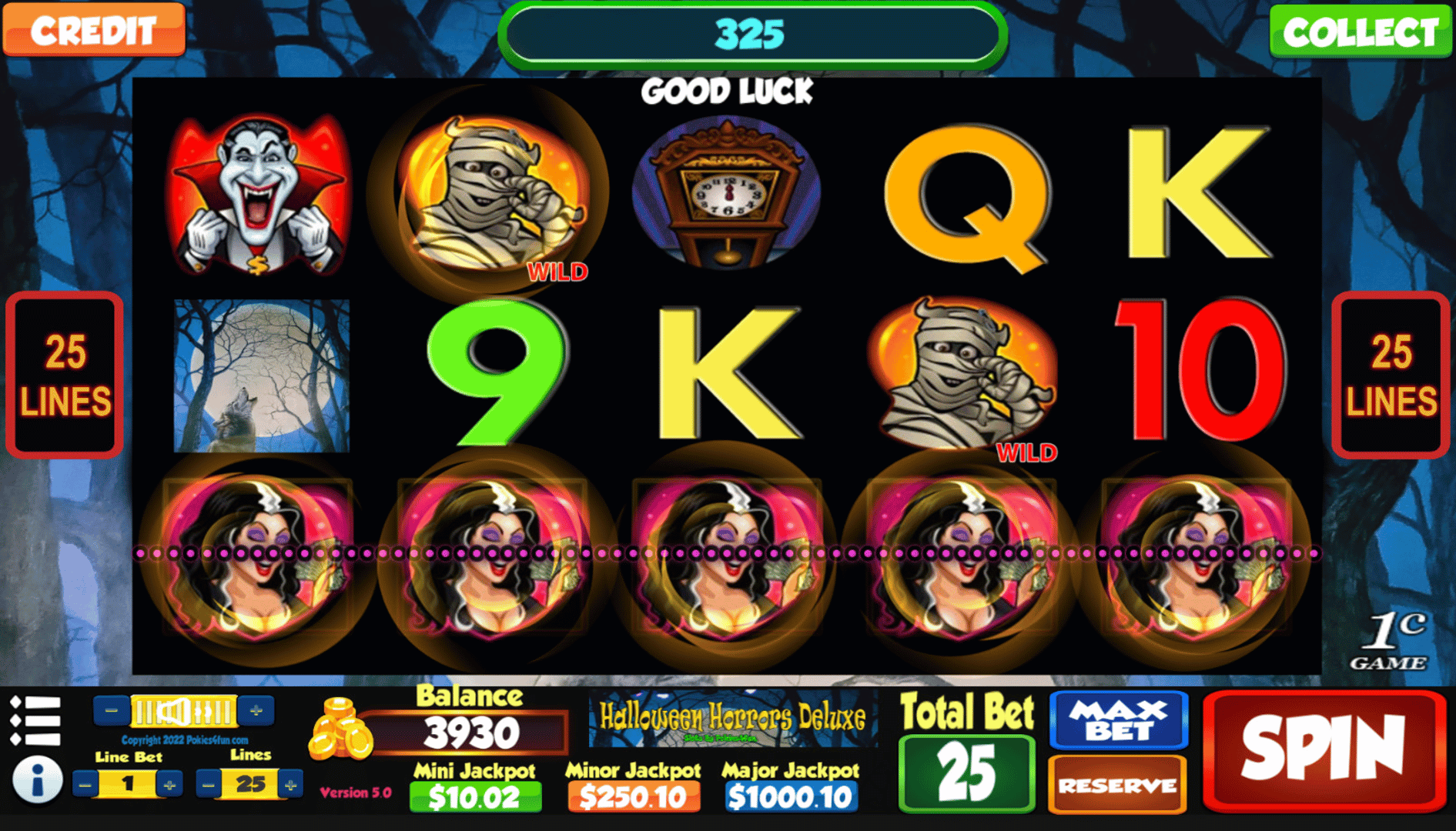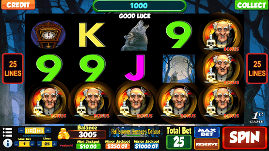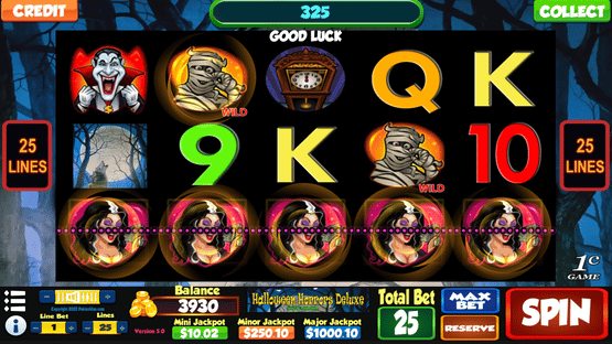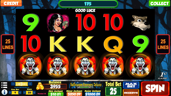 Halloween Horrors Deluxe is a 5 reel, 25 payline slot machine (pokie) with a Scary theme oriented from left to right.