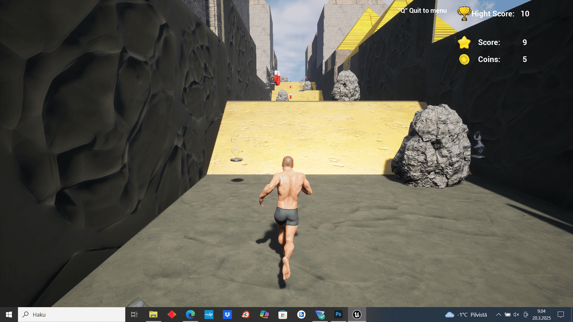 Endless runner game where mission is to collect glass coins and avoid rocks. Speed is increasing so try to survive as long as can