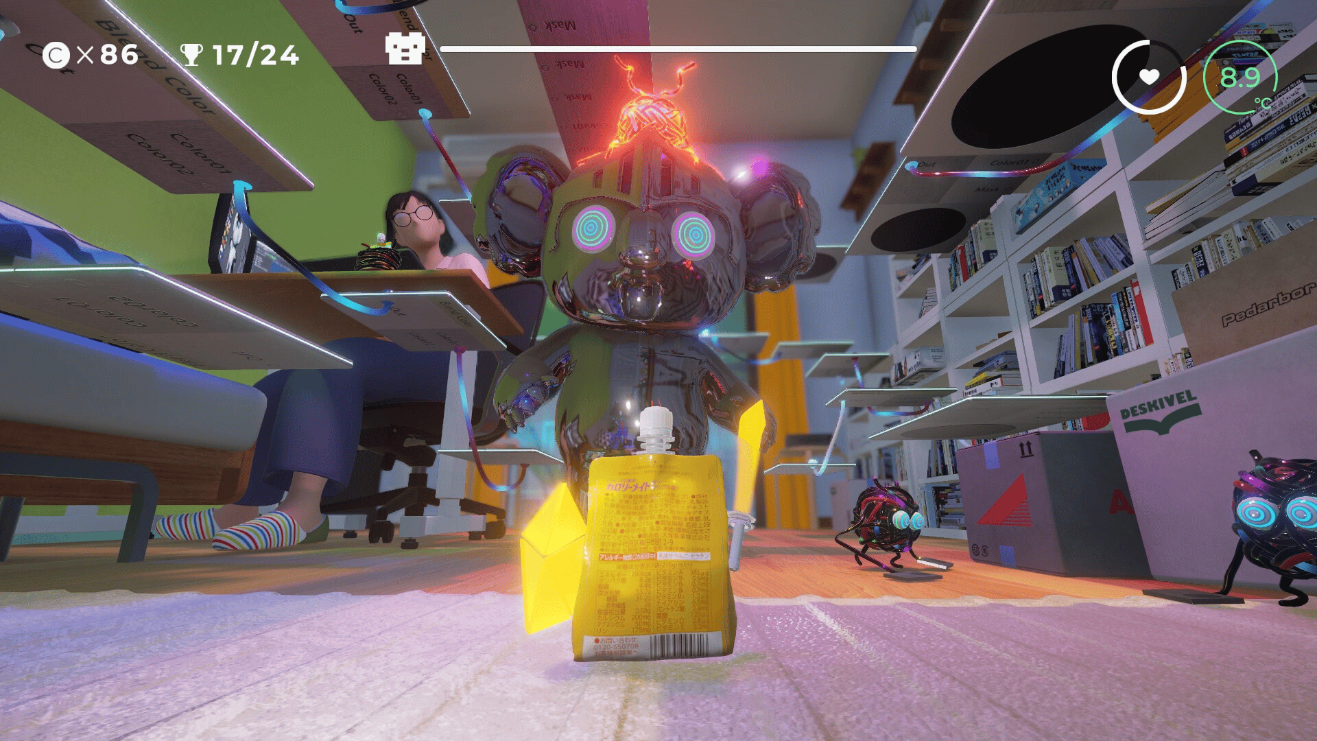 Transform into a Calorie Mate JELLY and deliver nutrition to a game creator immersed in work. This action-adventure takes you on a journey through an apartment room.