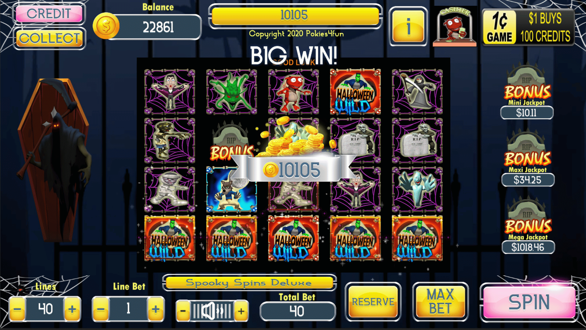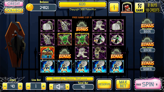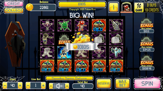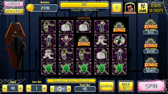 Spooky Spins Deluxe is a 4x5 reel, 40 payline slot machine (pokie) with a Spooky theme oriented from left to right.