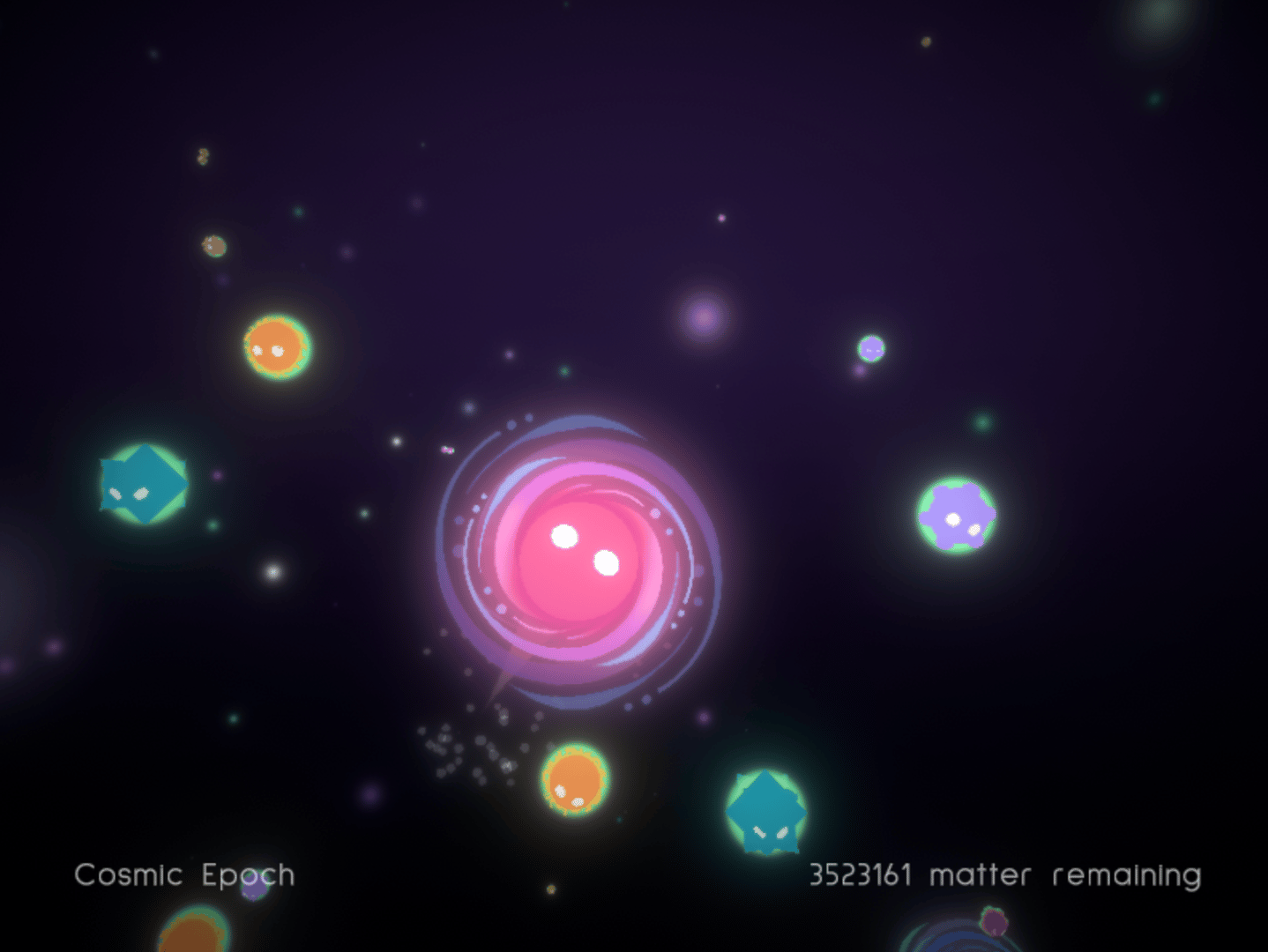 In EPOCH, you play through the major phases of the creation of the universe. In the beginning there was nothing, then there was a big bang and you come to life as a tiny quark. Quickly amass matter until you become a super massive black hole. Created in 72 hours for Ludum Dare 45 Jam. The theme was "Start with nothing".