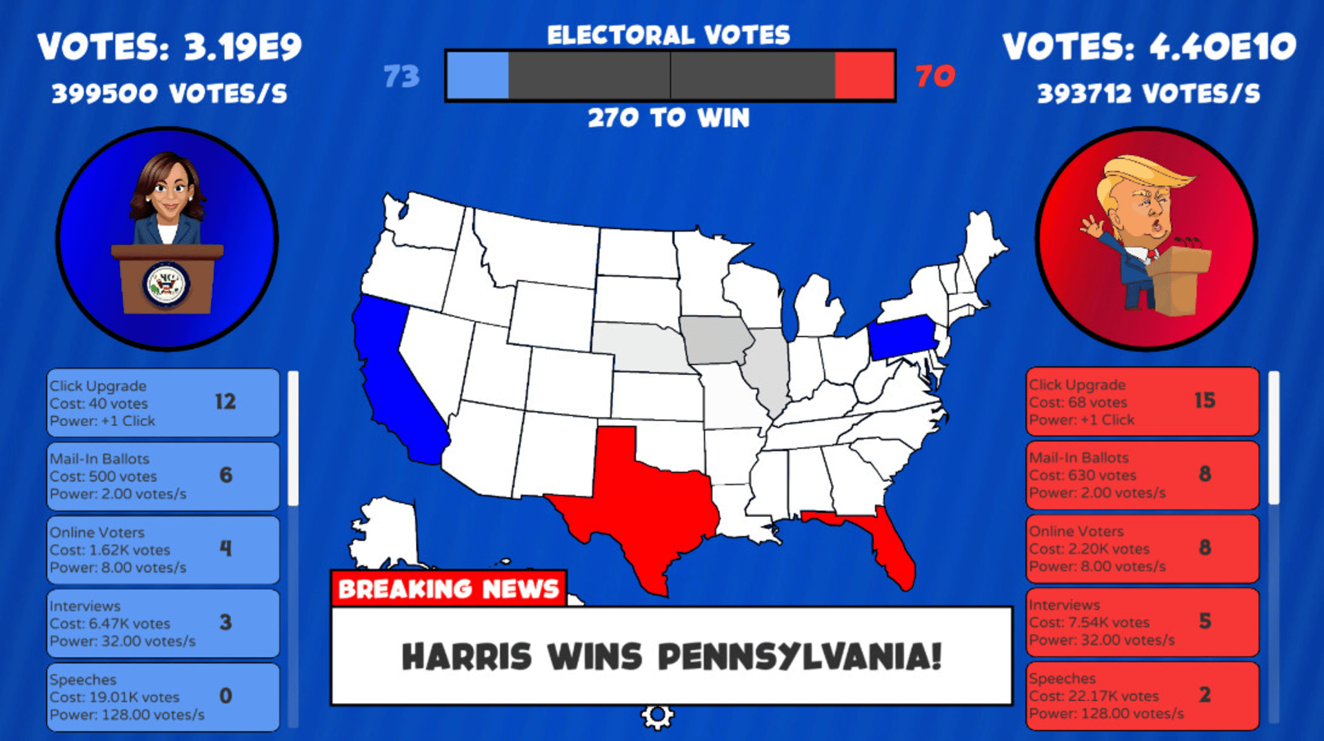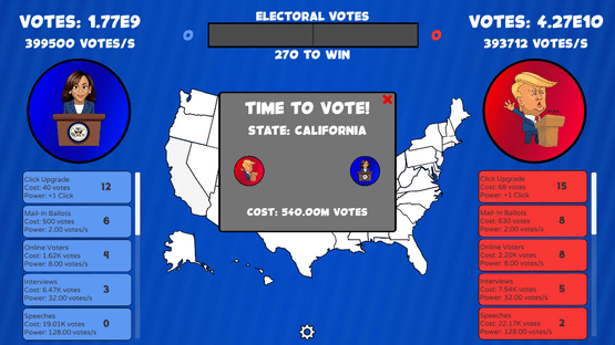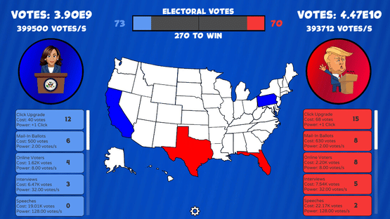 The presidential race turned clicker game! Click, gain upgrades, and win states to decide who will become the next president!